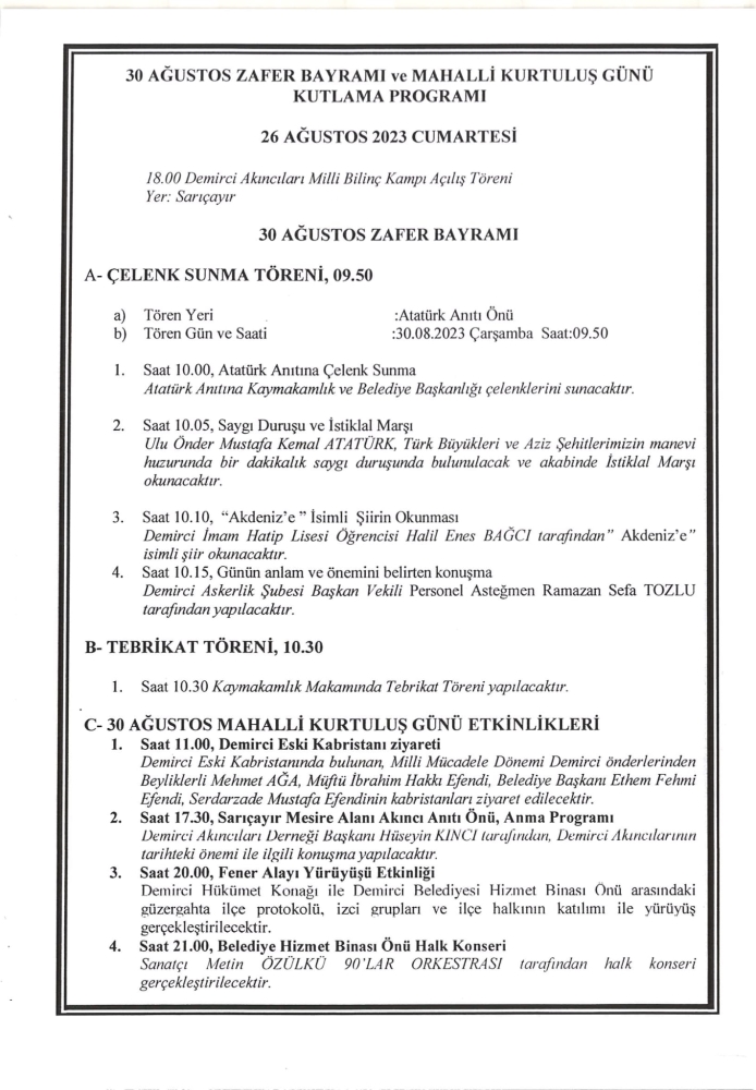DEMİRCİ'DE 30 AĞUSTOS ZAFER BAYRAMI RESMİ PROGRAMI