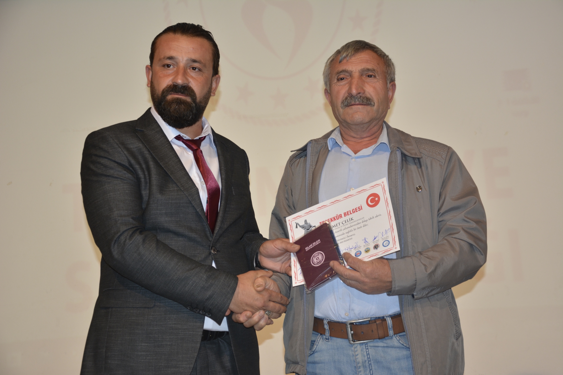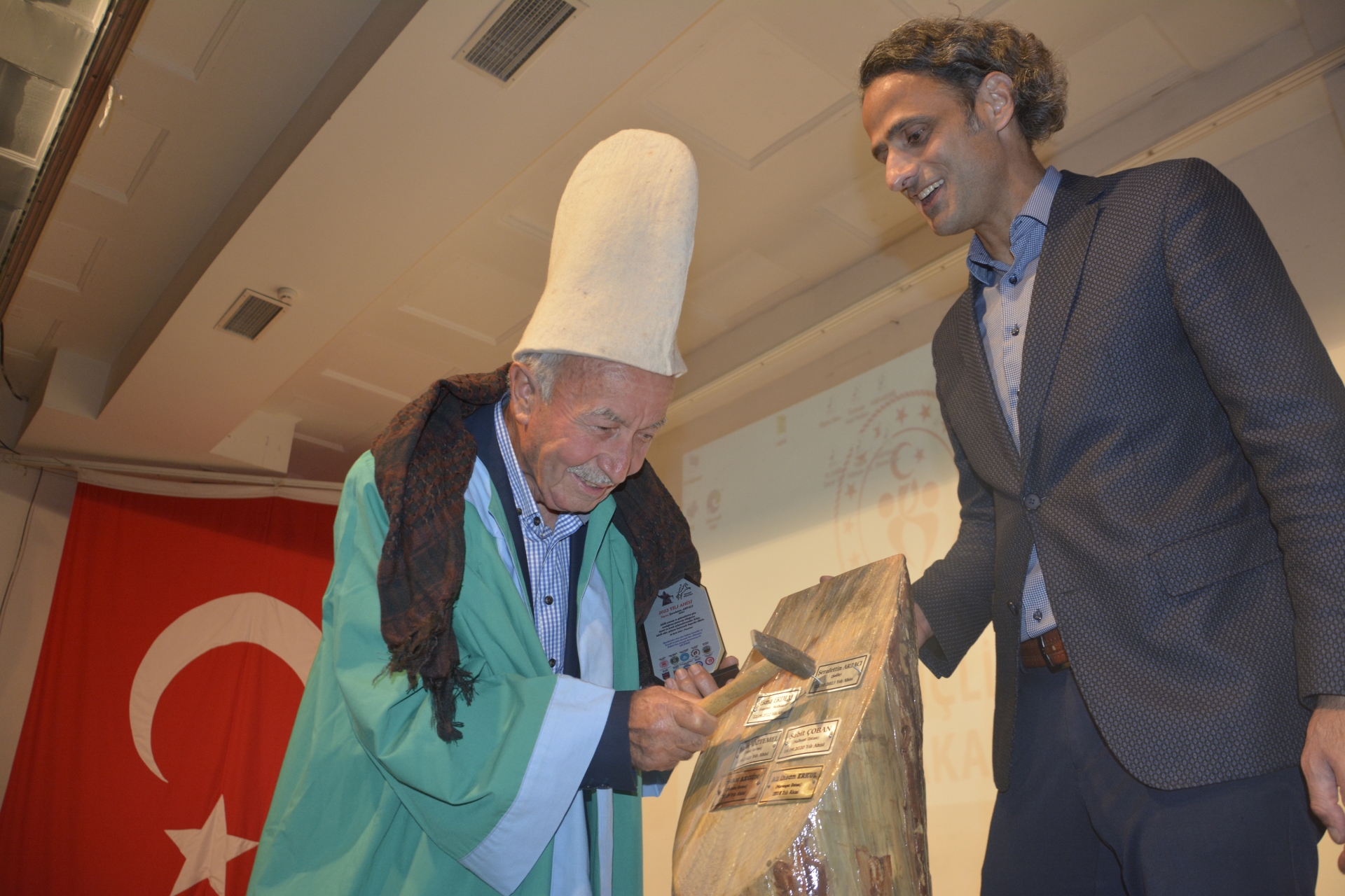 2023 Yılı Demirci Ahisi Şerafettin Arpacı'ya Ahilik Belgesi Demirci Belediye Başkanı Selami Selçuk tarafından verilirken, ahi kaftanını Demirci Kaymakamı Adem Kaya kuşatıldı.