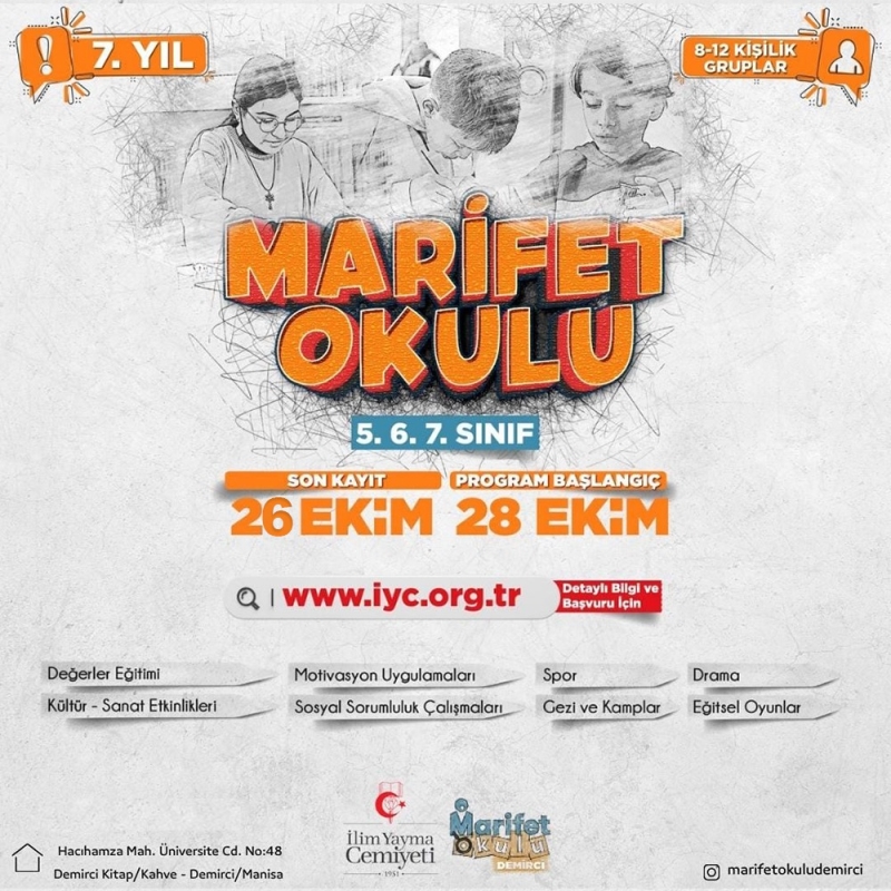 Demirci İlim Yayma Cemiyeti Şubesi öncülüğünde hafta sonları haftada bir yarım gün olacak şekilde 25 hafta devam edecek olan MARİFET OKULU'nu 28 Ekim'de faaliyetine başlıyor.
