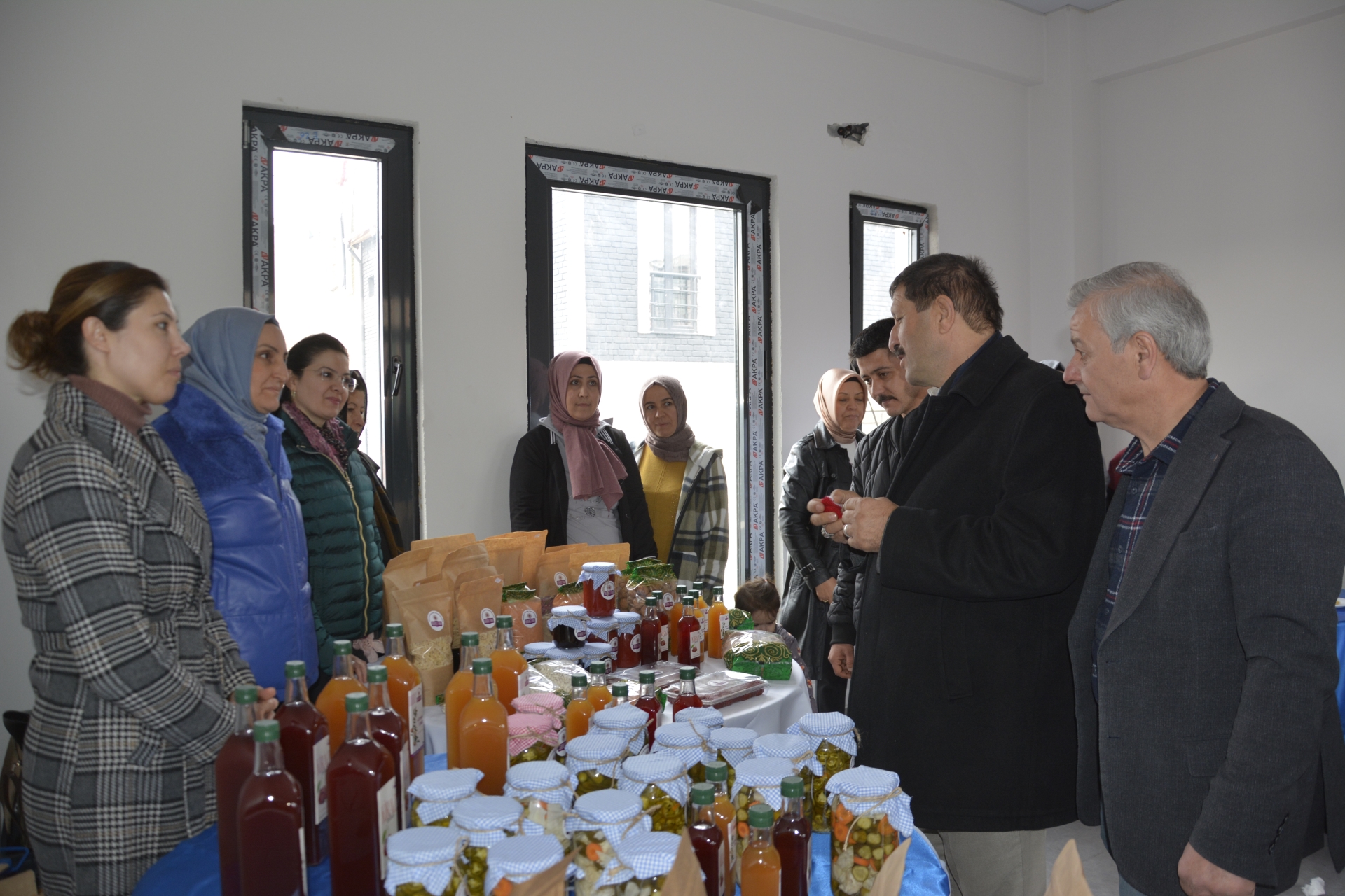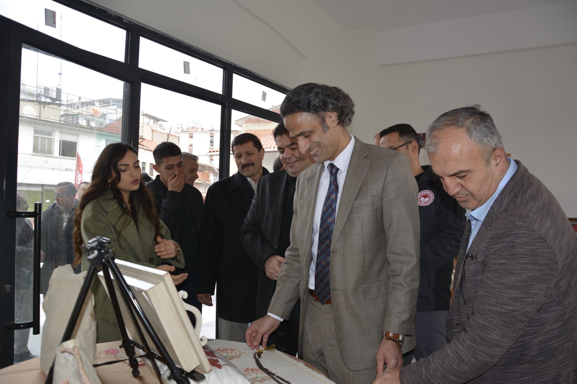 Kent merkezi girişinde kurulan sergide Halk Eğitimi Merkezi usta öğreticileri ve kursiyerlerinin emek vererek hazırladıkları eserler sergileniyor.