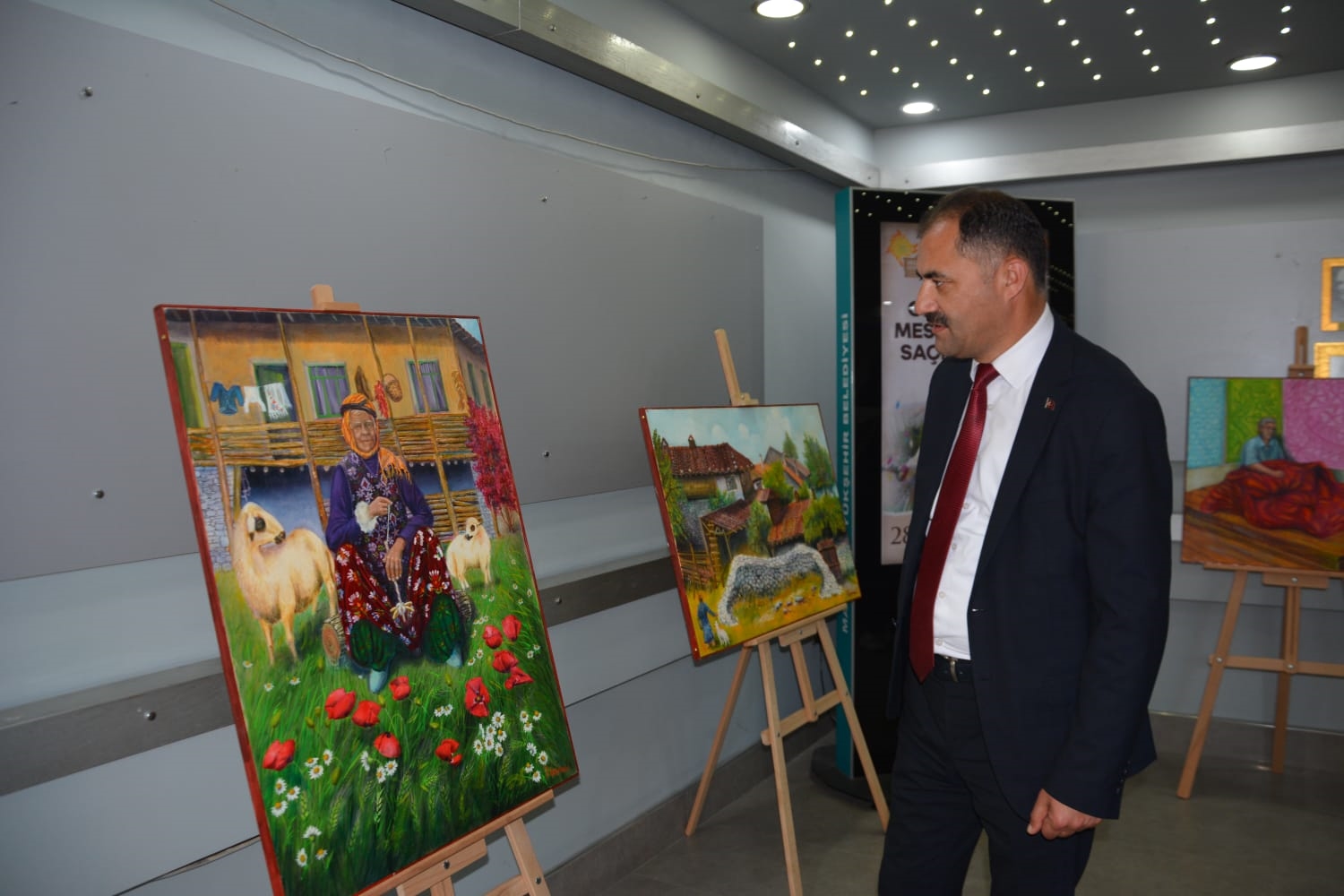 Ressam İsmail Çeşmeci sergide Belediye Başkanı Erkan Kara’ya eserlerini anlatarak, ziyaretinden dolayı teşekkür etti.