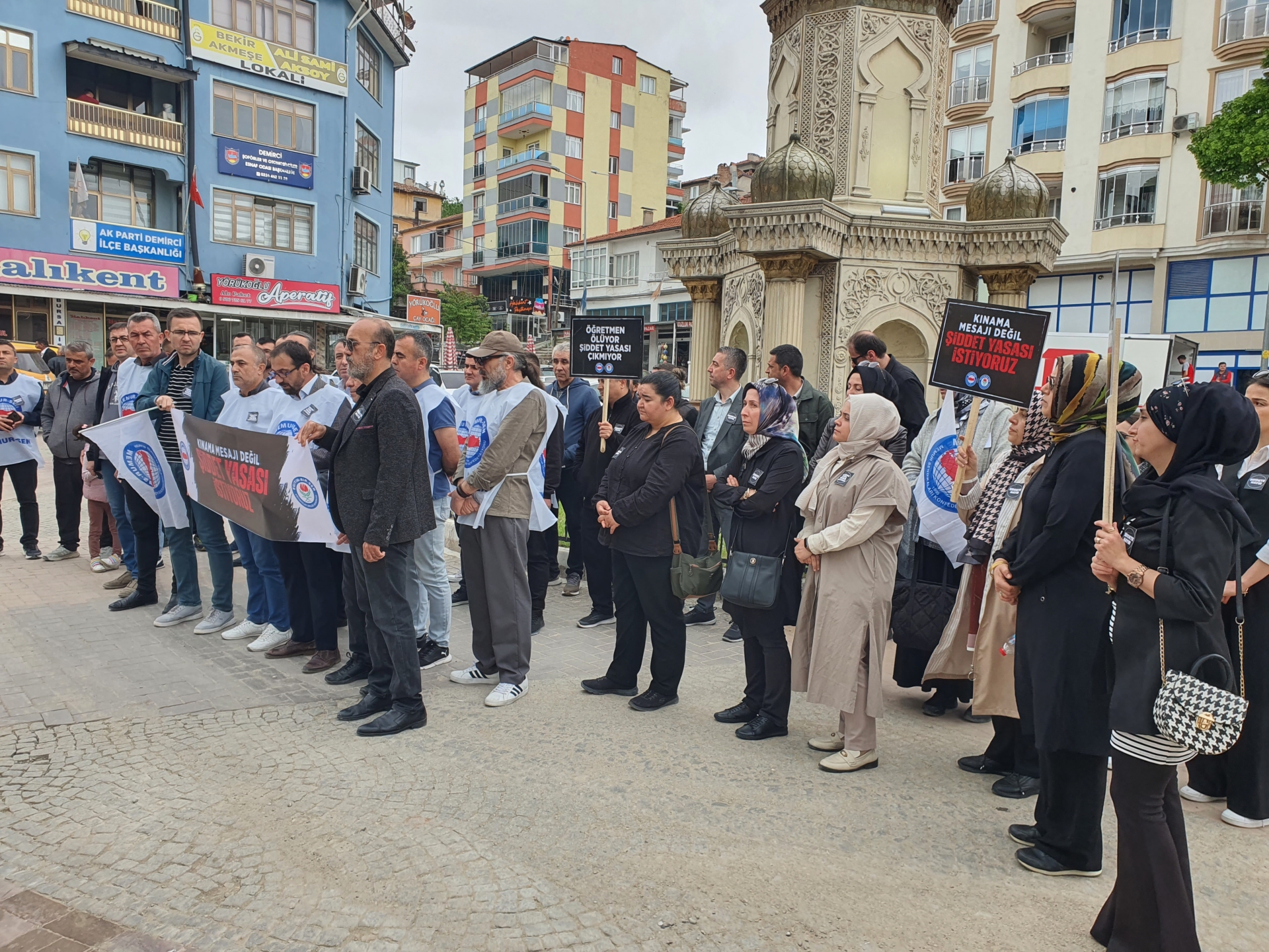 Eğitim-Bir-Sen İlçe Temsilcisi Mehmet Dağlar yaptığı açıklamada “ Eğitim çalışanlarına yönelik giderek artan şiddet olaylarını protesto etmek amacı ve şiddeti önleyecek, failleri cezalandıracak, mağdurlara hukuki koruma sağlayacak bir yasal düzenlemenin yapılması talebiyle bir araya gelmiş bulunmaktayız.