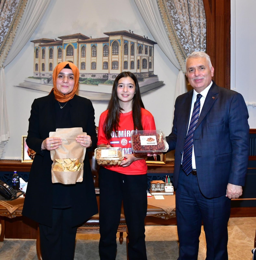 Sporcularımız Trabzon Valisi Aziz Yıldırım'a, Demirci'nin yöresel ürünleri olan Hünnap, Badem ve Demirci Kadın Kooperatifi'nin (DEMKA) hazırladıkları ürünleri hediye ettiler.