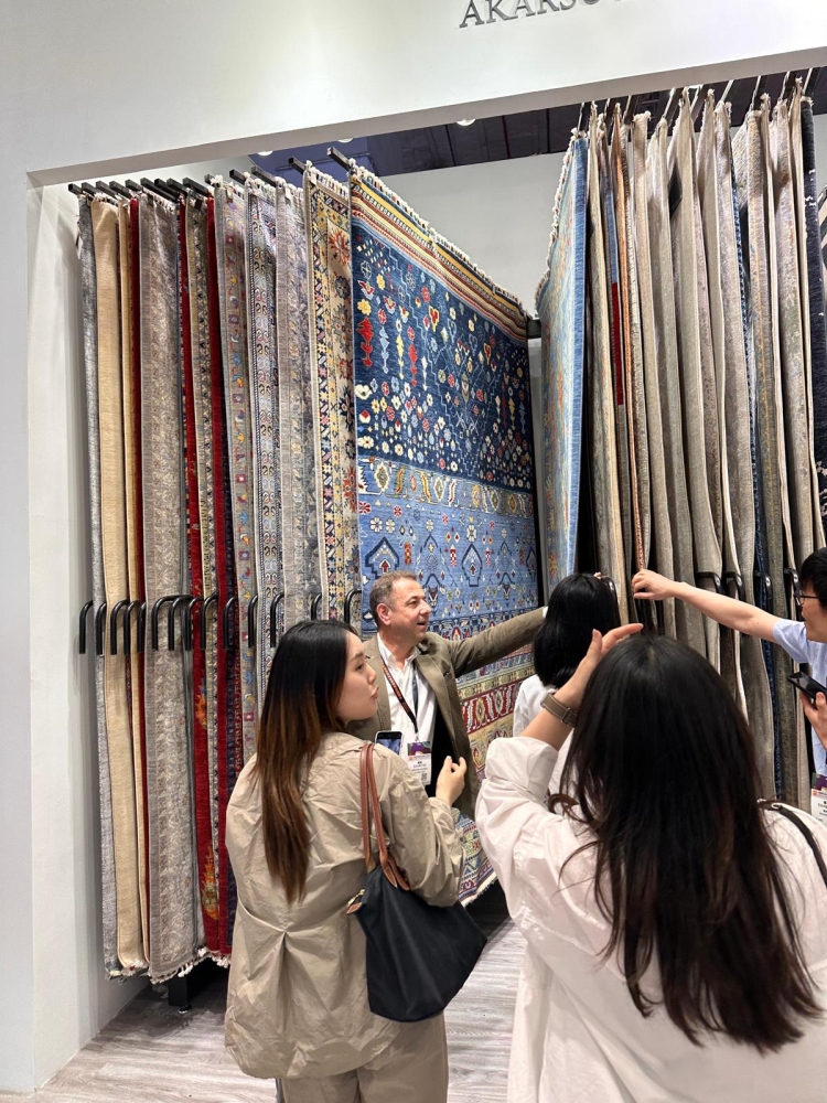 28-30 Mayıs 2024 tarihlerinde Şangay'ın National Exhibition And Convention Center fuar alanında Chinafloor 2024 fuarında katılımcı olarak yer alan Akarsu Halı firması sahibi İbrahim Akarsu, Demirci'de üretilen ev ve saray tipi halıların tanıtımını yapıyor.