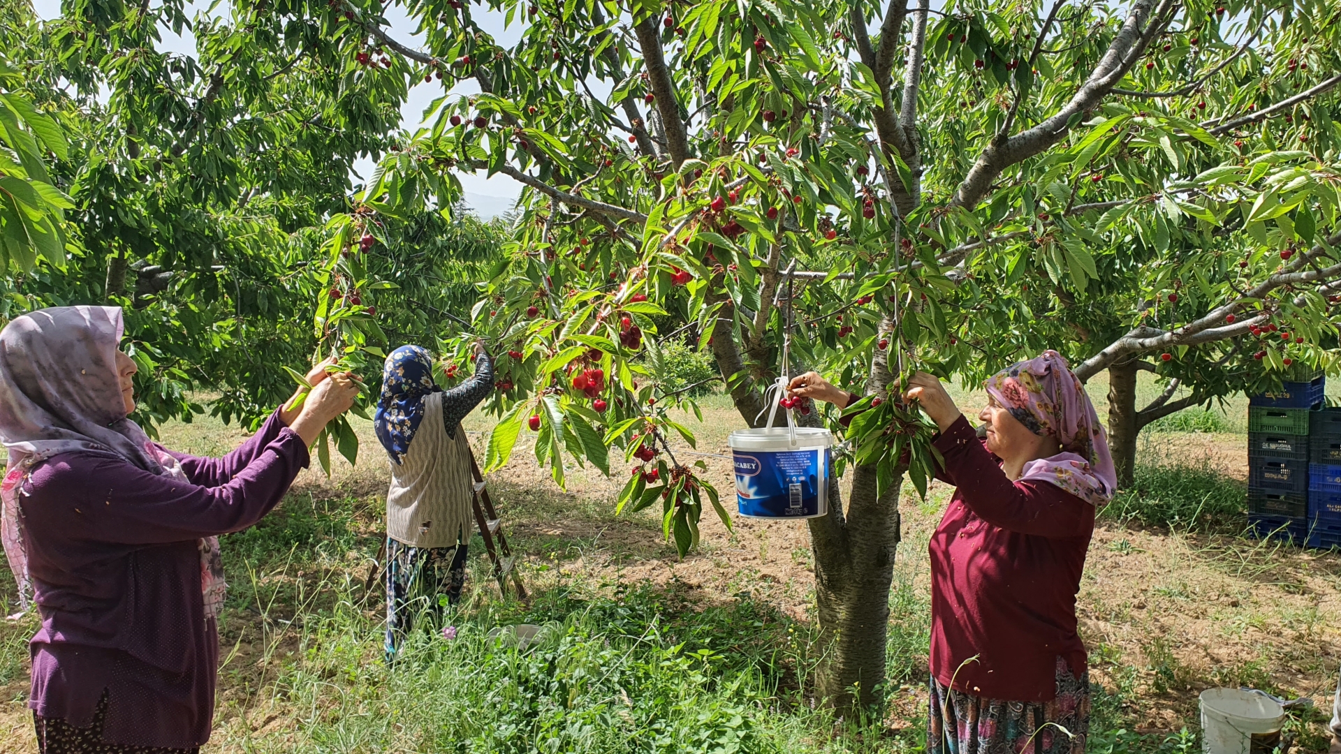 18 yıldır kiraz üreticiliği yapan Sabit Çoban ise” Hasadımız hazirandan eylüle kadar devam ediyor. Hasadı kadınlar ile birlikte yapıyoruz. 32 kalibre ve üzeri Avrupa’ya gönderiyor tüccarlarımız. 23 dönüm arazimde 600 ağaçla kiraz üretiyorum. Kiraz meyvesinin bakımı zor ama biz alıştığımız için kolay geliyor. Günlük tarlamdan 35 – 40 kasar çıkarıyoruz” dedi.