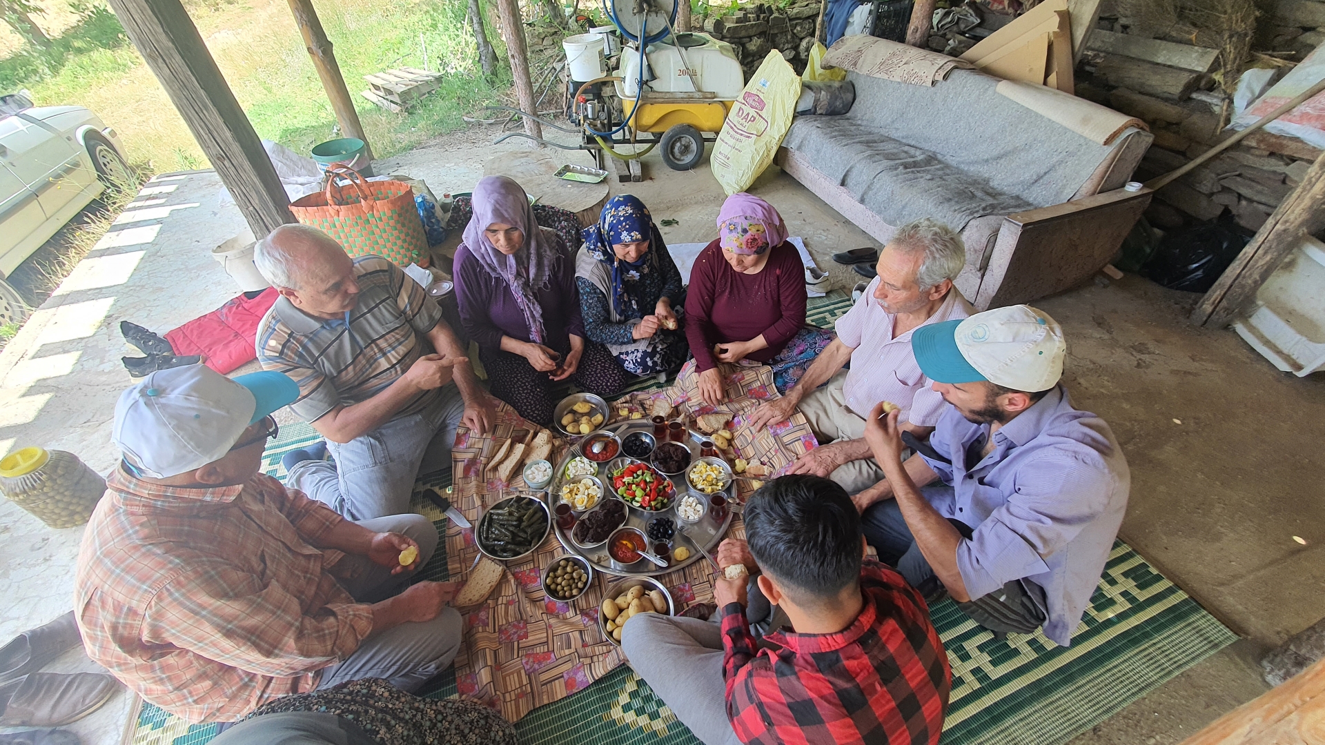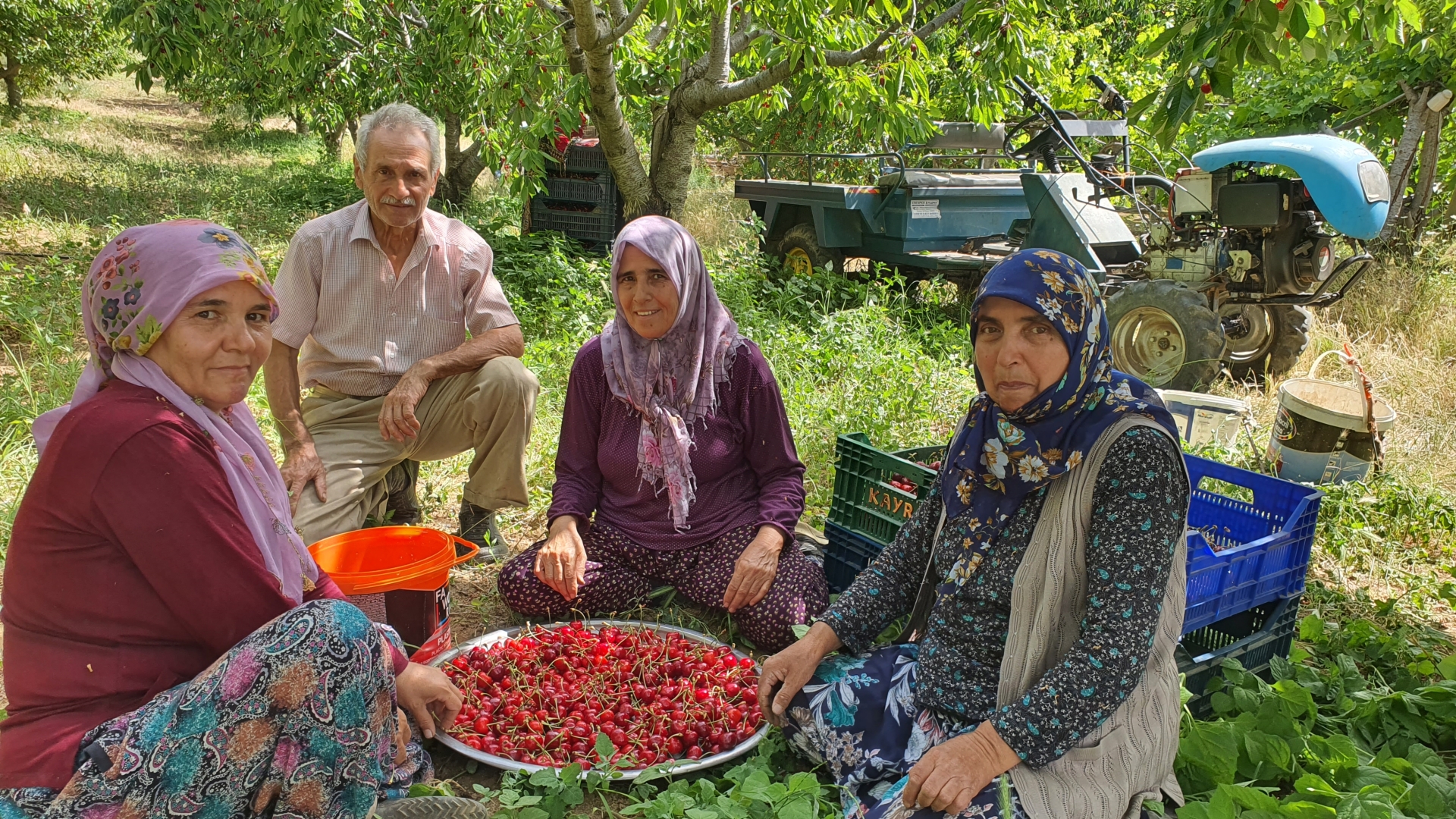 Tarlalarda yapılan kiraz hasadının ardından arazi sahibi ve çalışanlar hep birlikte kahvaltı yaptıktan sonra o günkü hasadı tamamlıyorlar.
