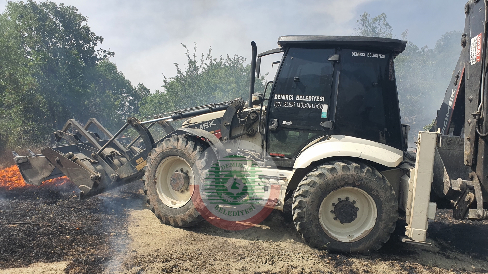 Arazi yol çalışması için bölgede olan Demirci Belediyesine ait kepçe yangın bölgesine sevk edilerek alevlere müdahale etti.
