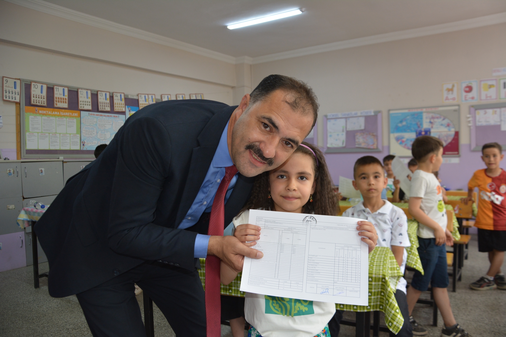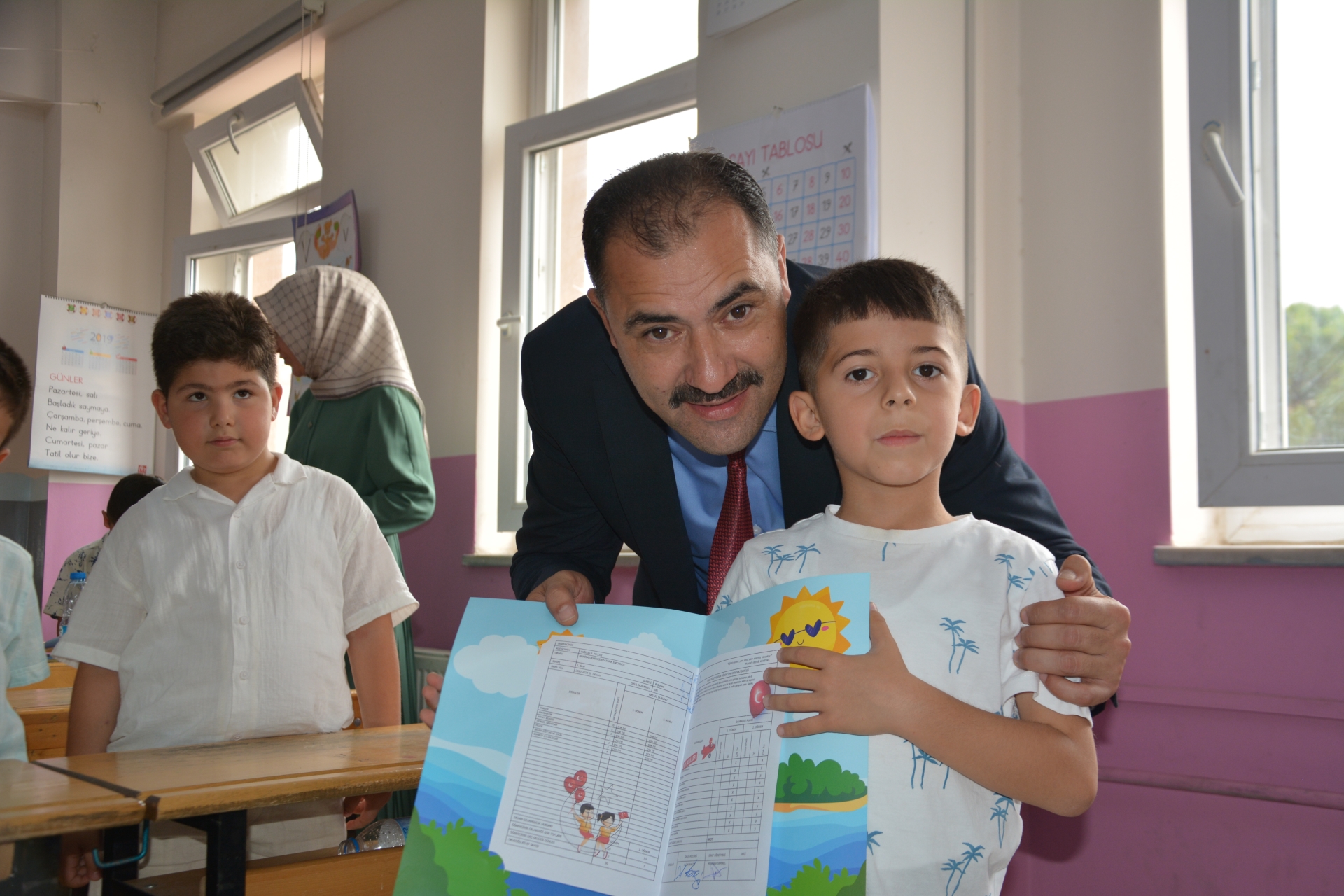 Kaymakam Adem Kaya, Başkan Erkan Kara ve Milli Eğitim Müdürü Bilal Çetinkaya, Hikmet Arsal Anaokulu, Cumhuriyet İlkokulu, Atatürk İlkokulu, Fatih Ortaokulu ve İmam Hatip Ortaokulunda öğrencilere karnelerini takdim ettiler.