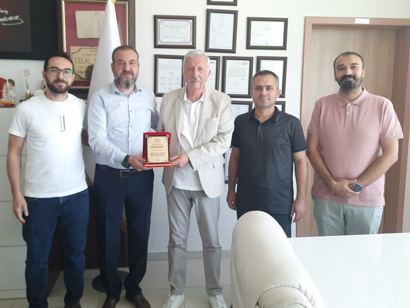 Demirci Devlet Hastanesi Başhekimi Dr. Levent Onat, hayırsever Ayşe Koçyiğit’in oğlu Hüseyin Koçyiğit’e hastaneye yapılan cihaz bağışından dolayı plaket takdim ederek, teşekkür etti.