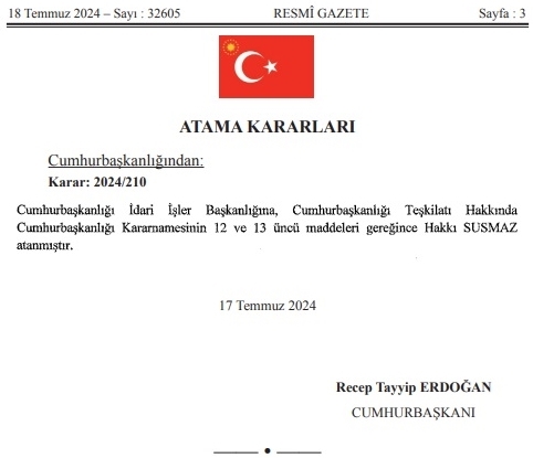 18 Temmuz Perşembe günü Cumhurbaşkanımız Sayın Recep Tayyip Erdoğan imzalı resmi gazetede yayınlanan atanama kararnamesi ile Cumhurbaşkanlığı İdari İşler Başkanlığı görevine Hakkı Susmaz atandı.