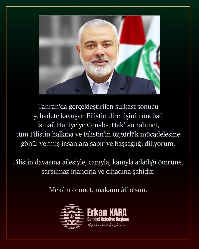 Başkanımız Erkan Kara mesajında " Tahran'da gerçekleştirilen suikast sonucu şehadete kavuşan Filistin direnişinin öncüsü İsmail Haniye'ye Cenab-ı Hak'tan rahmet, tüm Filistin halkına ve Filistin'in özgürlük mücadelesine gönül vermiş insanlara sabır ve başsağlığı diliyorum. Filistin davasına ailesiyle, canıyla, kanıyla adadığı ömrüne, sarsılmaz inancına ve cihadına şahidiz. Mekânı cennet, makamı âli olsun" dedi.