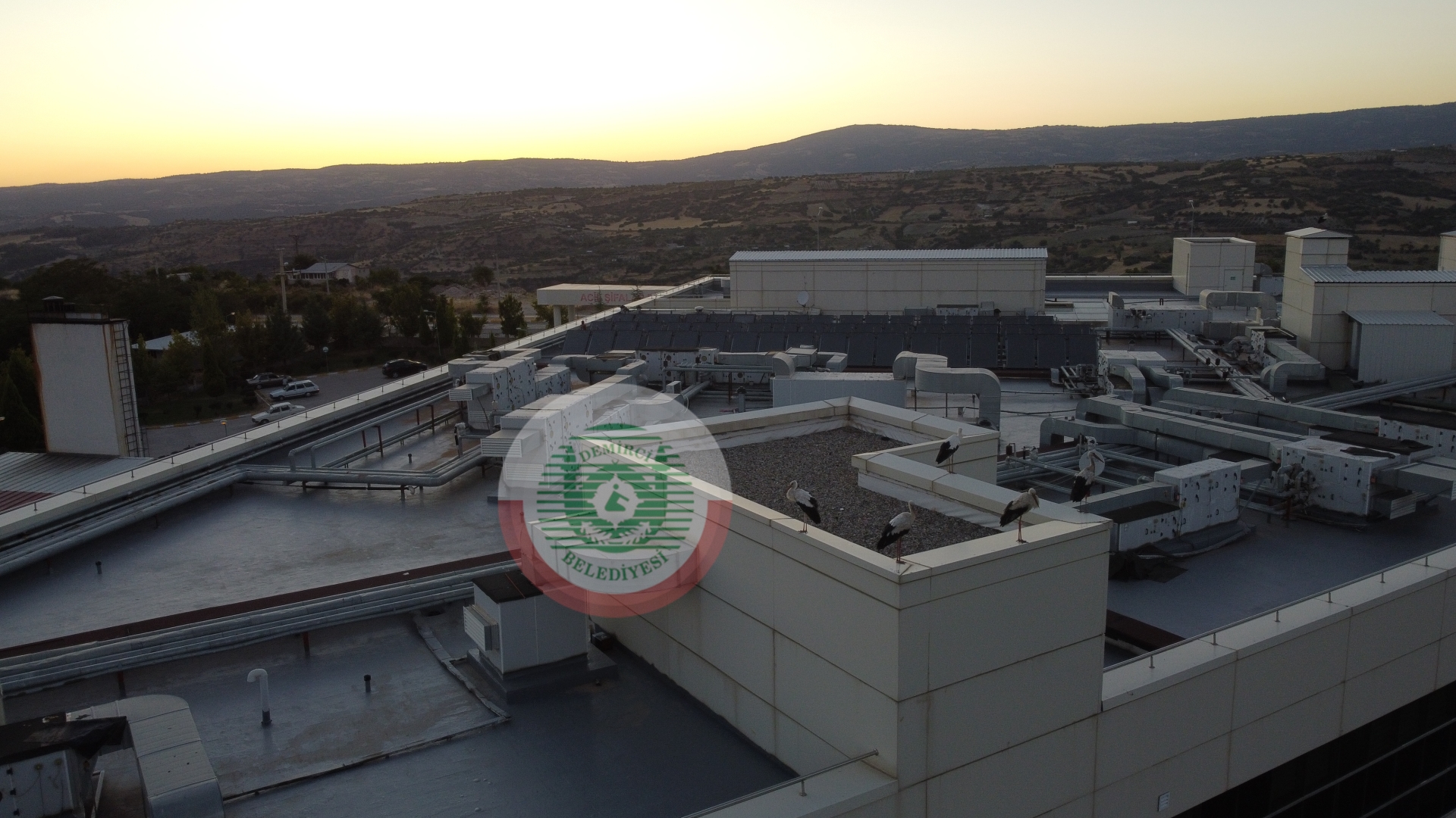 Göç yolundaki çok sayıda leylek İlçe girişinde bulunan hastanenin çatısına ve yol boyunca yer alan aydınlatma direklerine kondu.