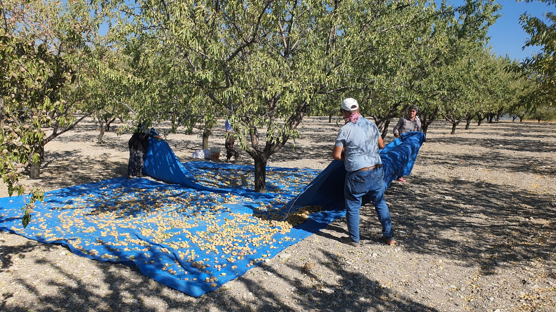 Çiftçiler badem ağaçlarının altına serdikleri örtü üzerine bademlerini silkme işlemini yaptıktan sonra çuvallara katarak traktörlere yüklüyorlar.