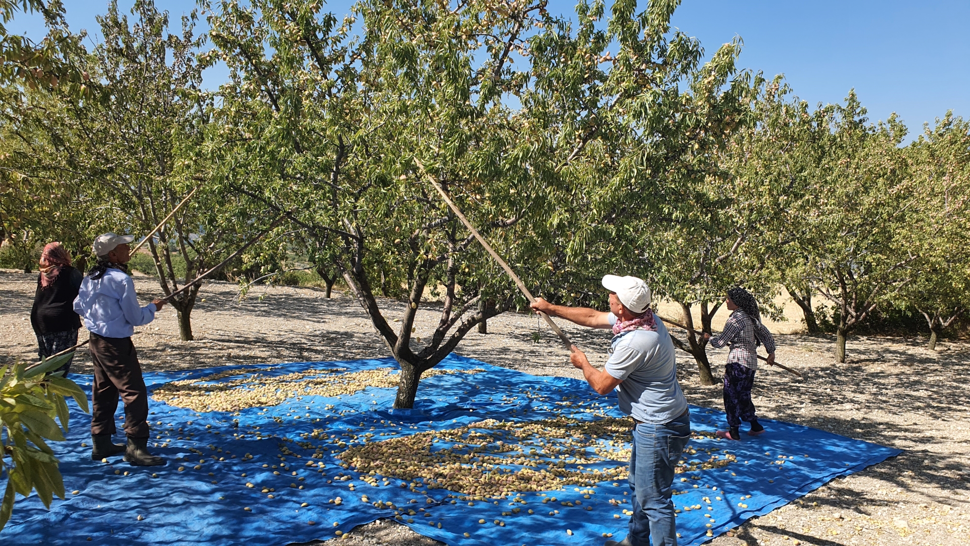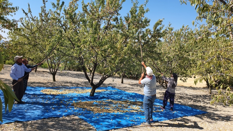 Sabahın erken saatlerinde tarlalarına giden çiftçiler sırıklar marifeti ile bademlerini silkiyor.