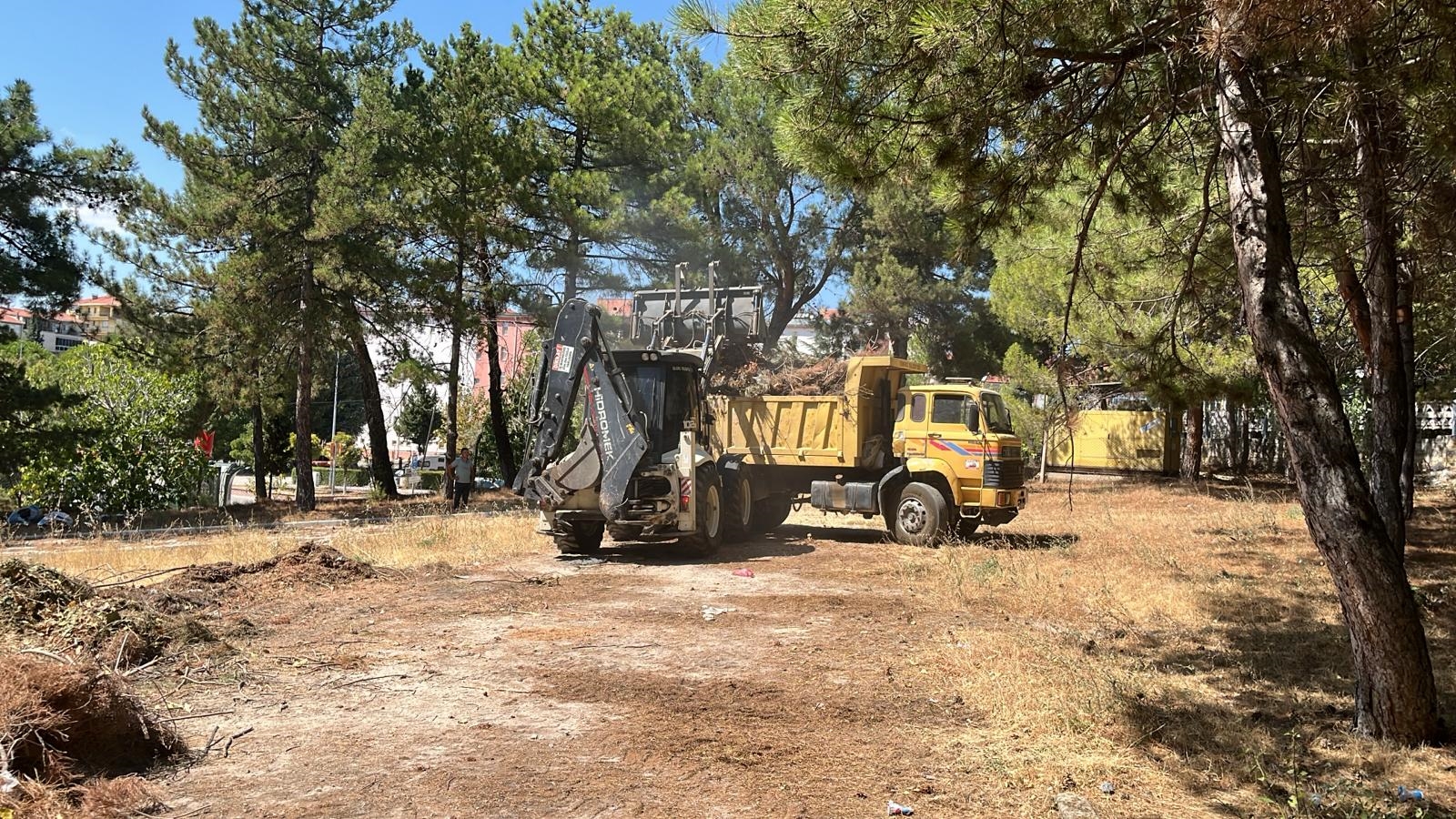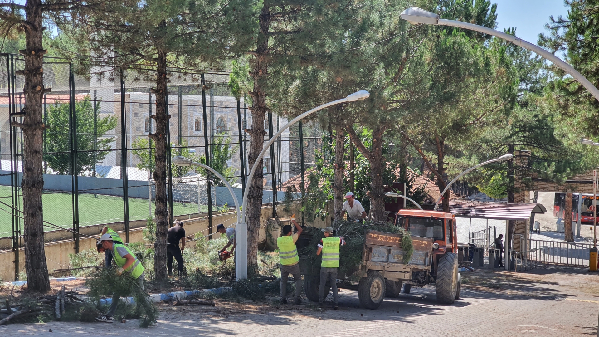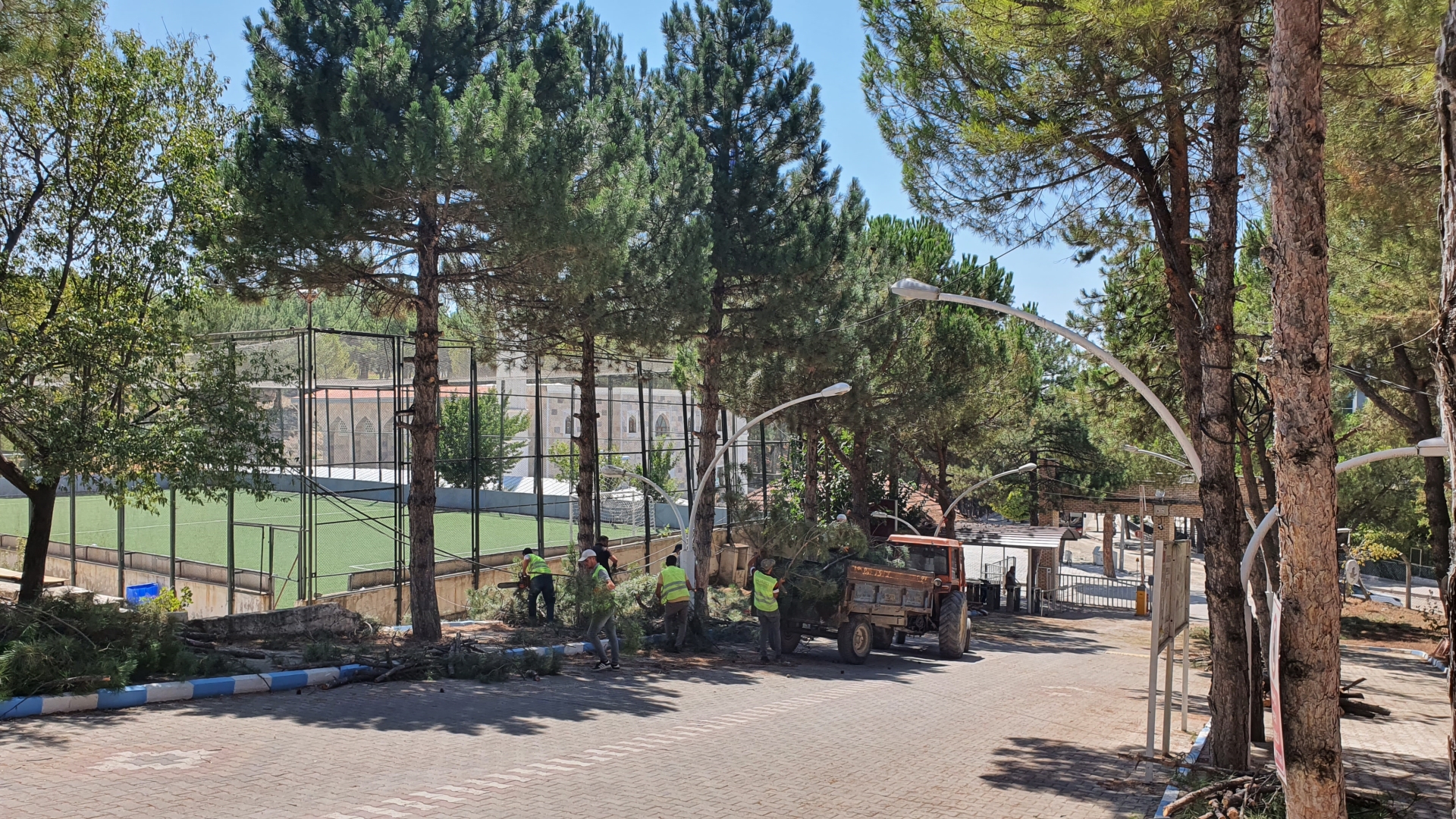 Eğitim Fakültesi girişinde bulunan görüş mesafesini etkileyen ve alanı kapatan ağaçların dallarında budama yapılırken, çamlık içerisinde çöp ve moloz temizliğine başlandı.