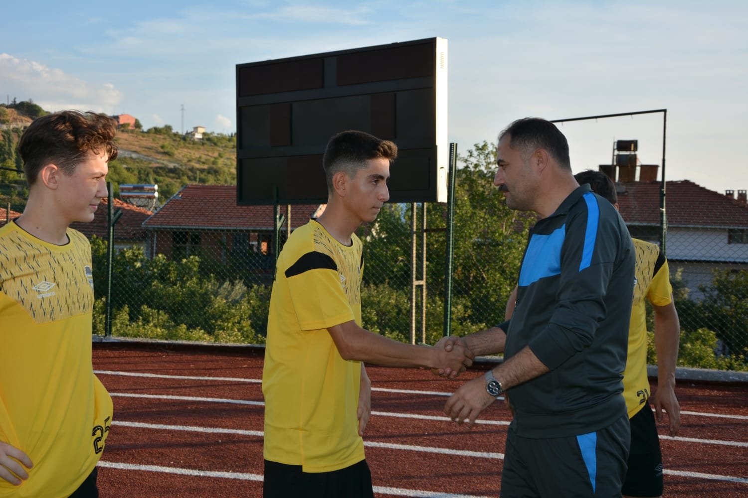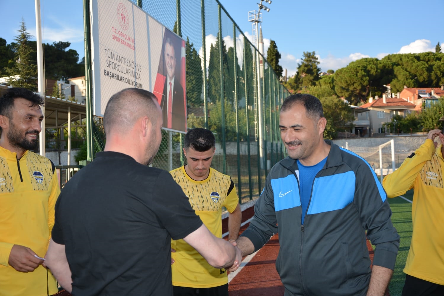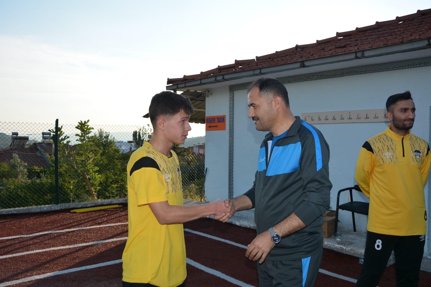 Kulüp Başkanı Abdullah Demirkol ve futbolcular tarafından karşılanan Başkanımız Erkan Kara, sporcularla tek tek selamlaştı.