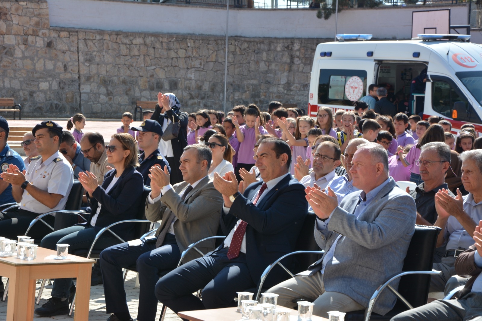 Okula ilk kez başlayan 1. sınıflara yönelik tanışma etkinliğinin düzenlendiği programda öğrenciler Türk bayrakları ile ilçe protokolünü selamladılar.