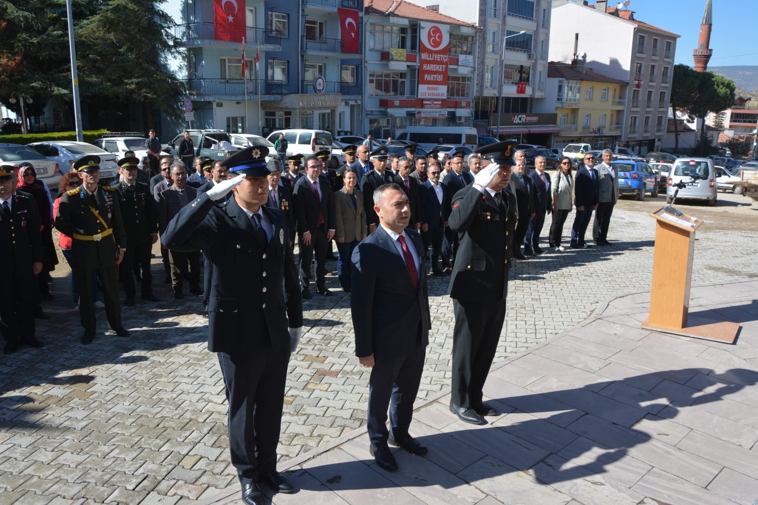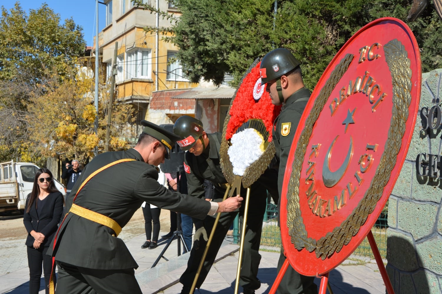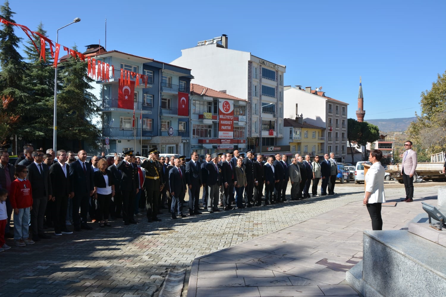Törende ilk olarak Kaymakamımız Yavuz Arslan, Belediye Başkanımız Erkan Kara, Garnizon Komutanı Mly. Binbaşı Hüseyin Cihan Korkmaz tarafından Atatürk anıtına çelenk sunumu yapıldı.