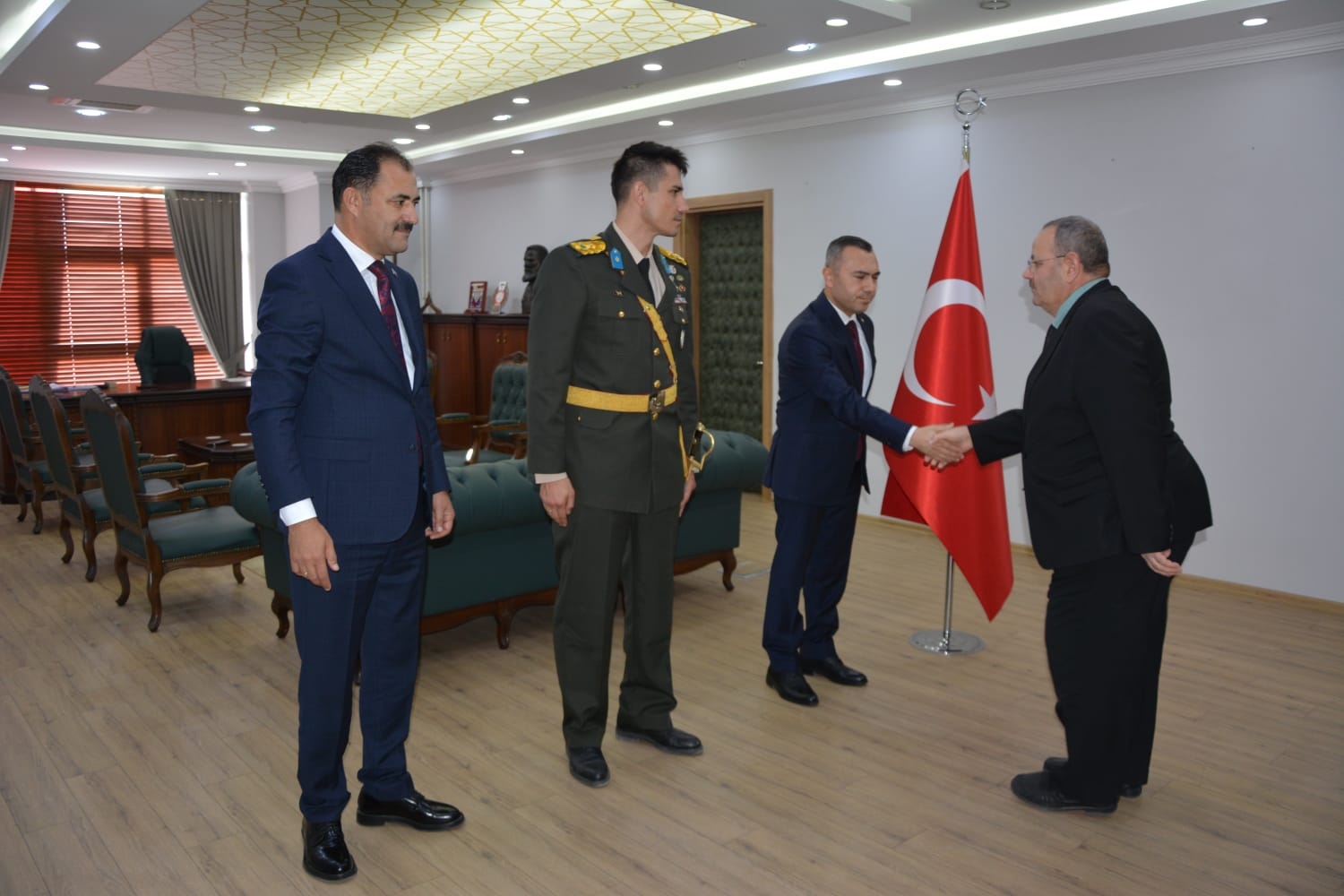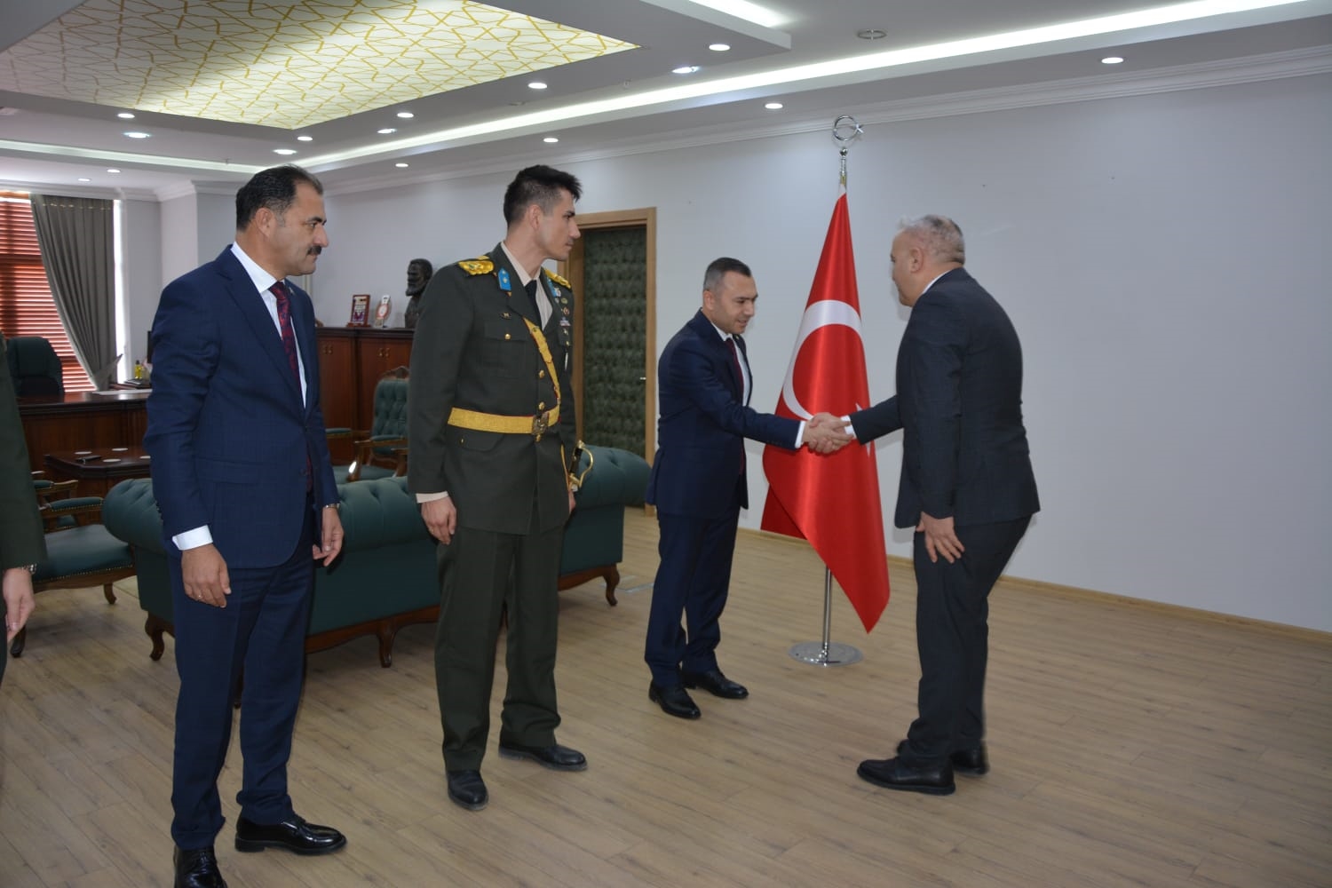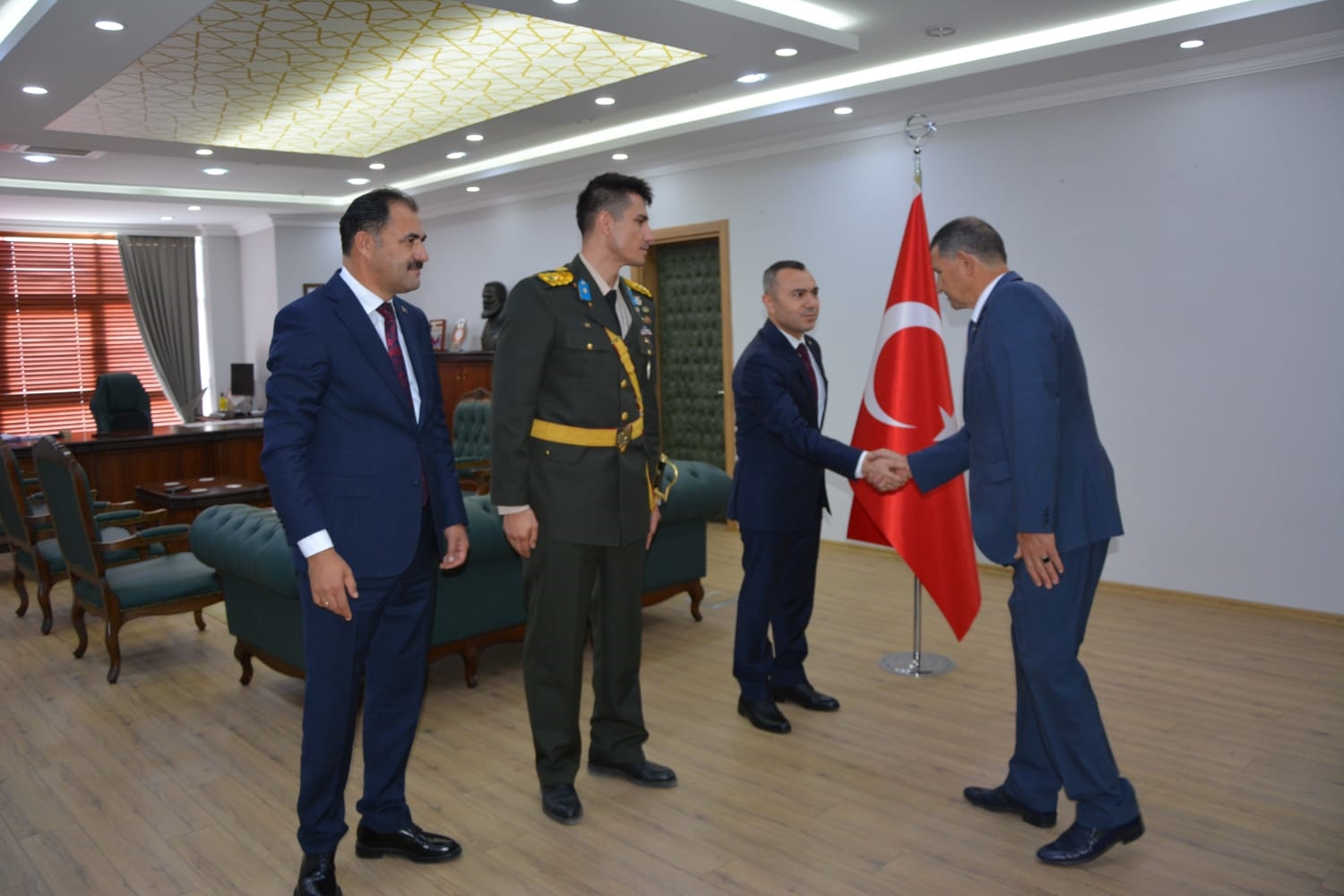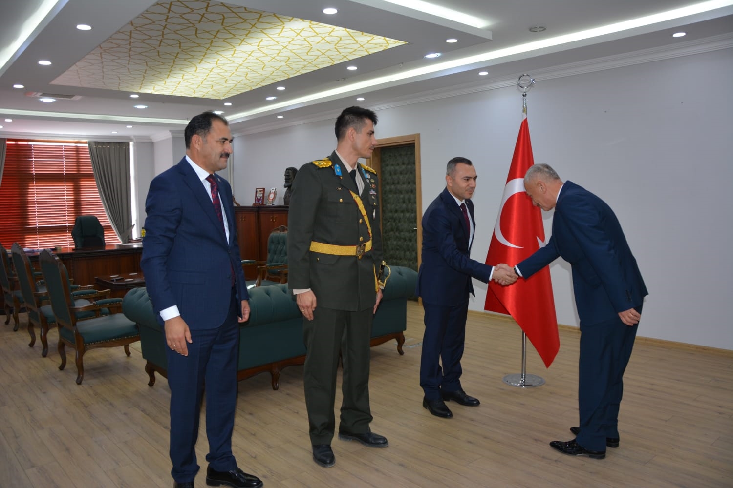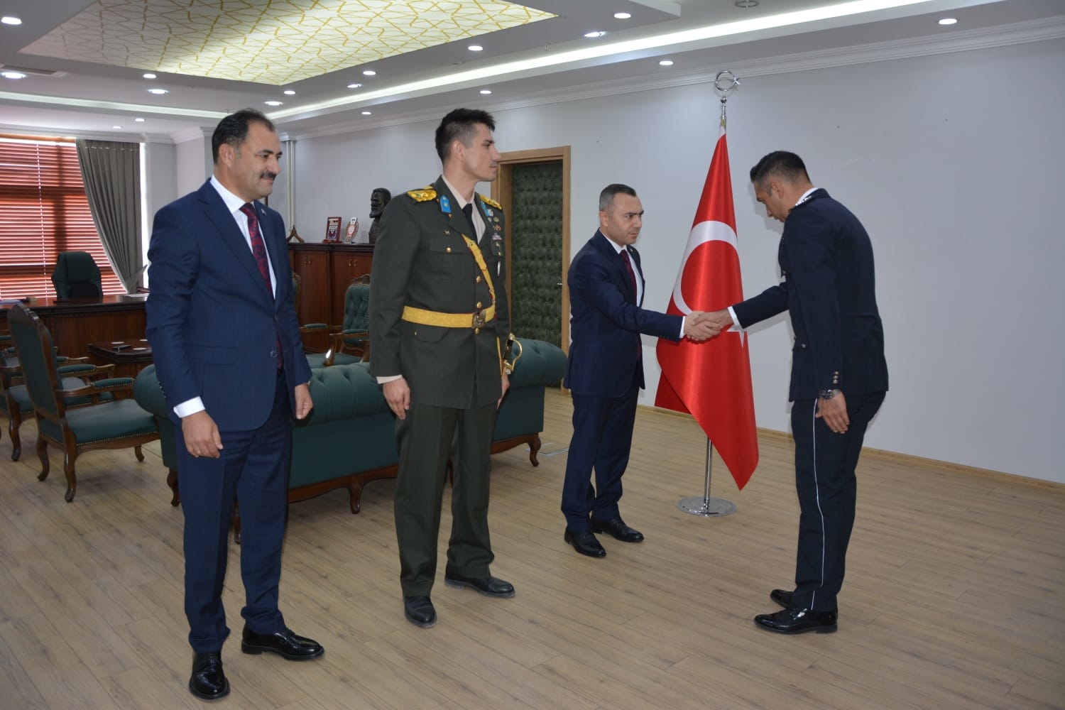 Kaymakamlık makamında düzenlenen tebrikat törenin ardından Kaymakamımız Yavuz Arslan, Garnizon Komutanı Mly. Binbaşı Hüseyin Cihan Korkmaz ve Belediye Başkanımız Erkan Kara törenlerin yapılacağı Kaymakam İbrahim Ethem Akıncı stadına geçiş yaptılar.