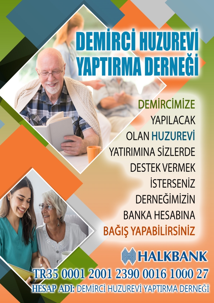Bağışta bulunmak isteyenler “ Demirci Huzurevi Yaptırma Derneği “ TR35 0001 2001 2390 0016 1000 27 nolu IBAN’a nakdi olarak bağışlarını yapabilirler.