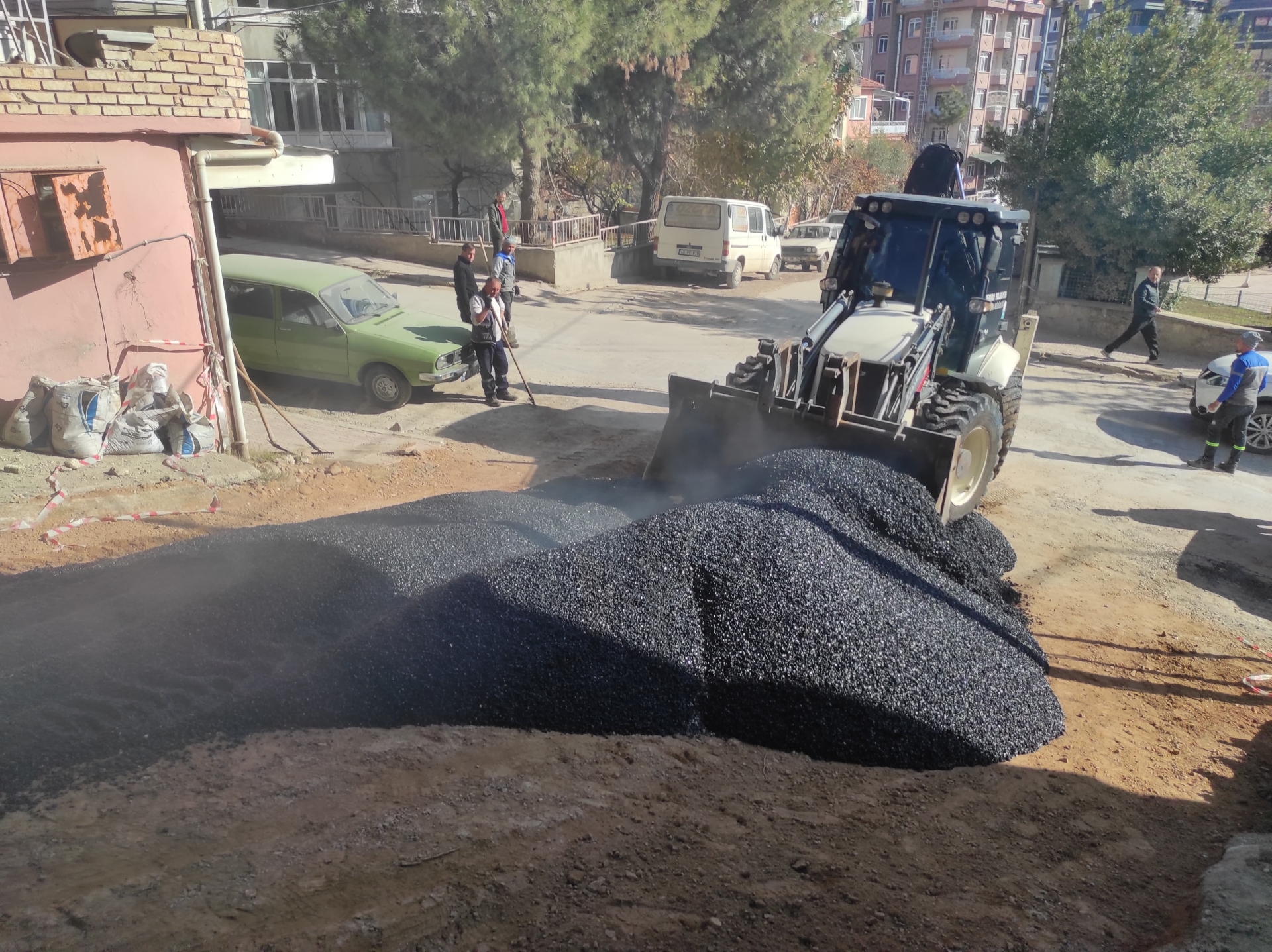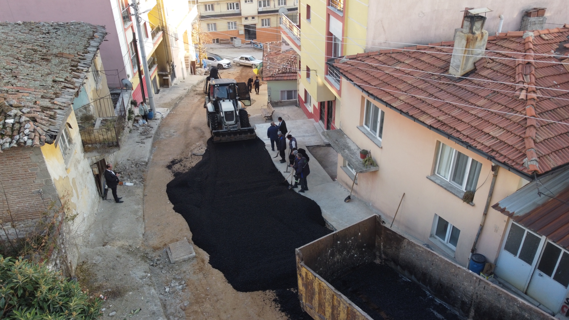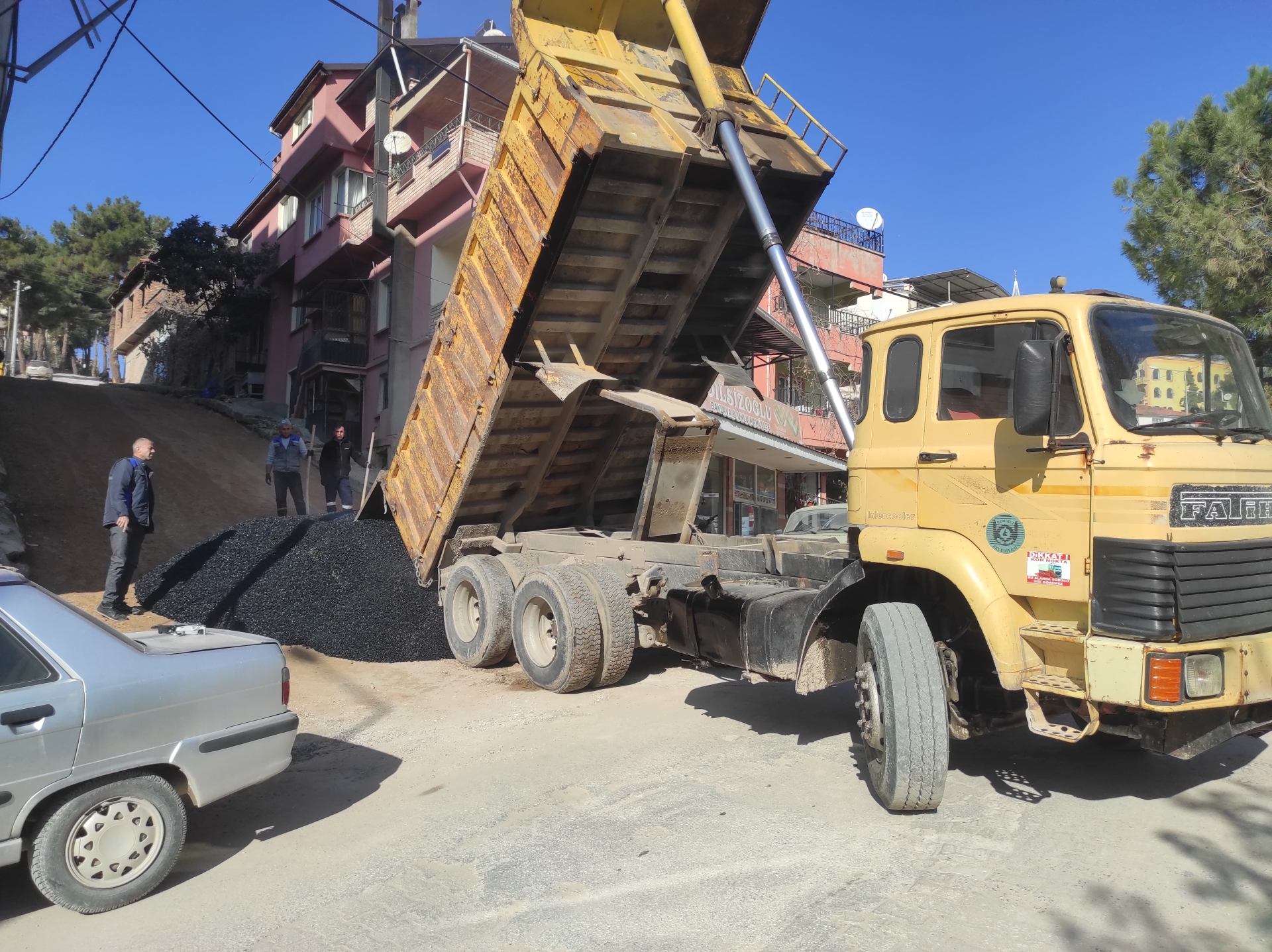 Şantiyede hazırlanan sıcak asfalt belediyemiz kamyonları ile Fatih Mahallesi Gül sokağa sevk edildi.