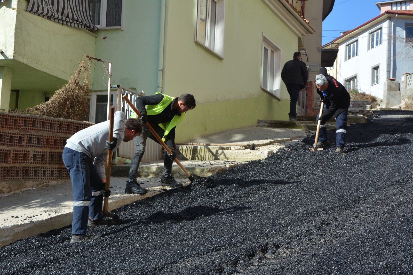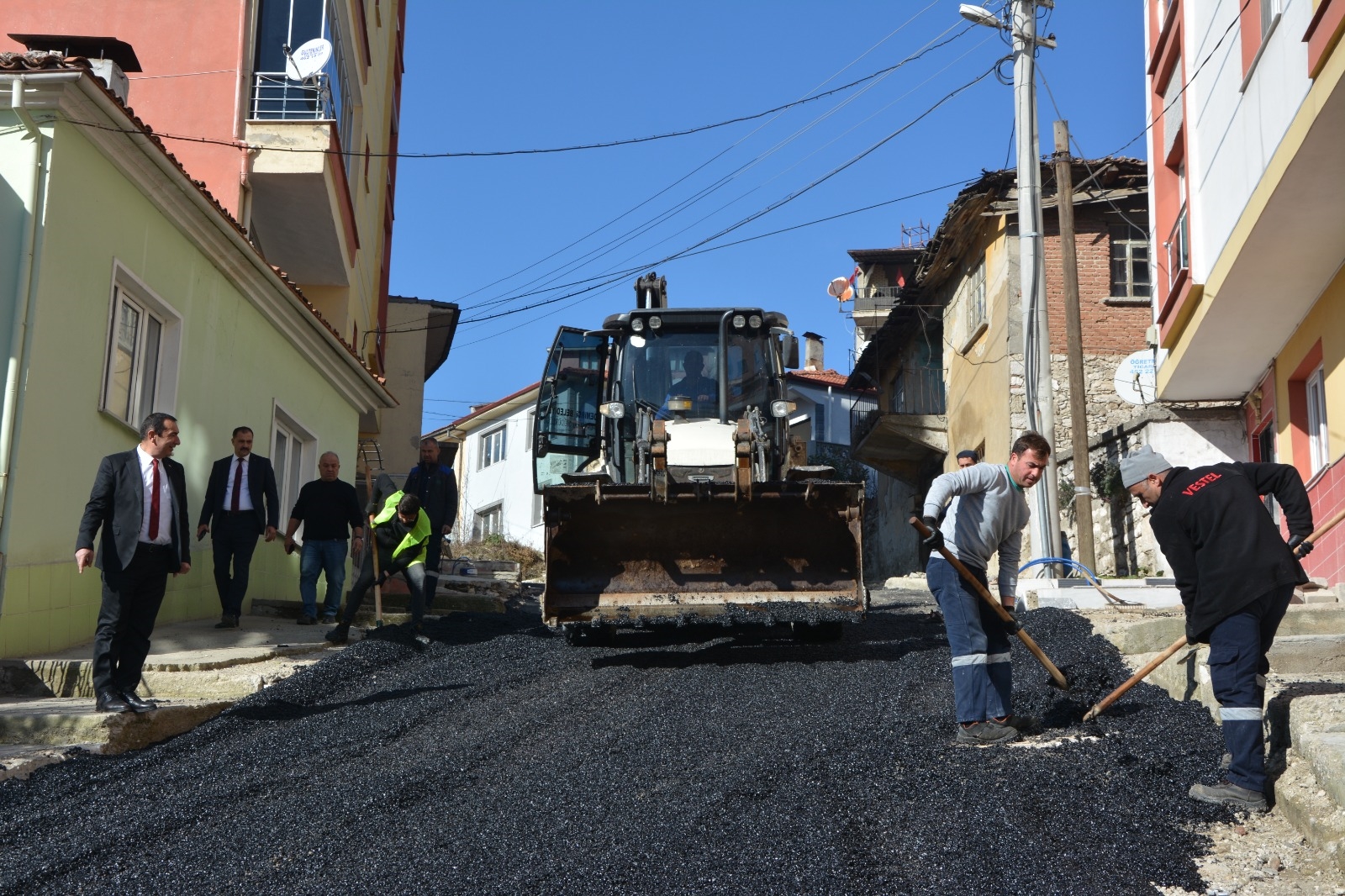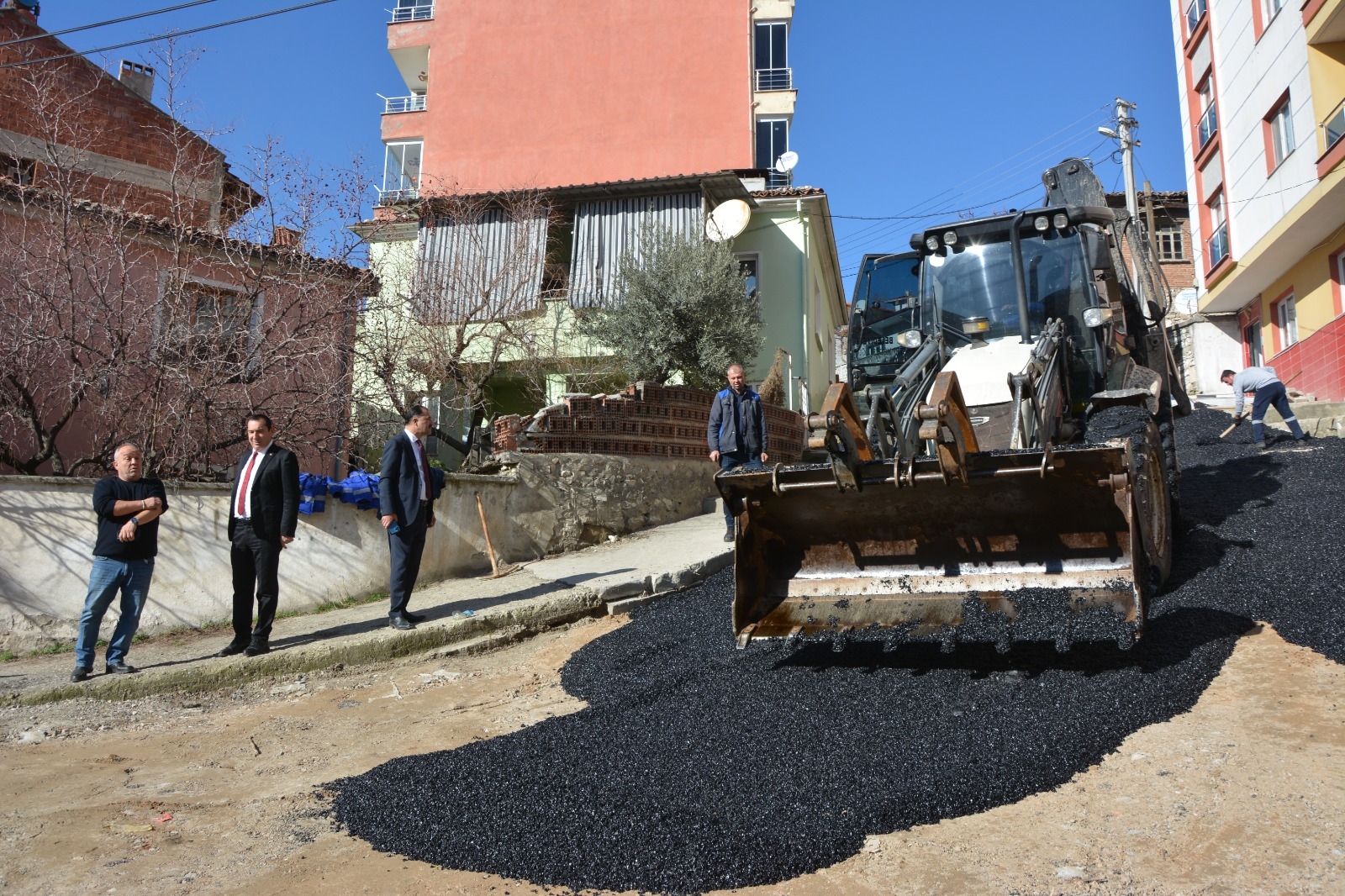 İlçe merkezinde altyapı çalışmalarının tamamlandığı güzergâhlarda havaların ısınması ile birlikte asfalt plent makinesi ile üretilen sıcak asfalt Kasımfakı Mahallesi Akıncılar caddesindeki rampaya serildi.