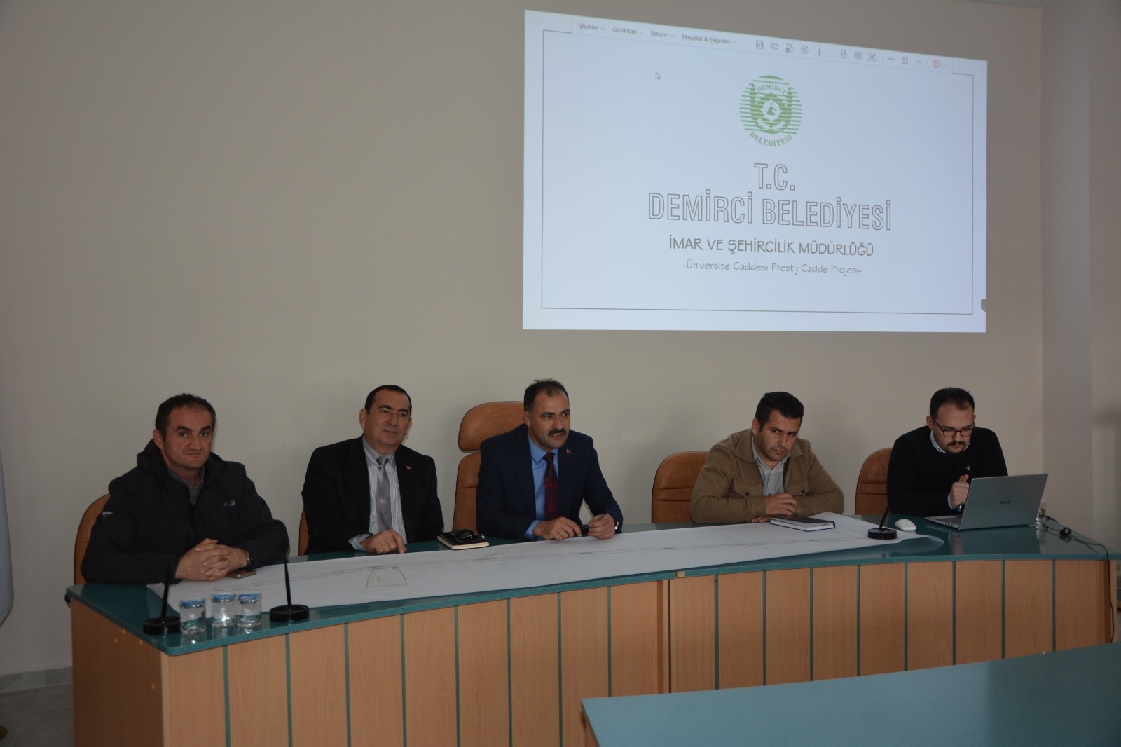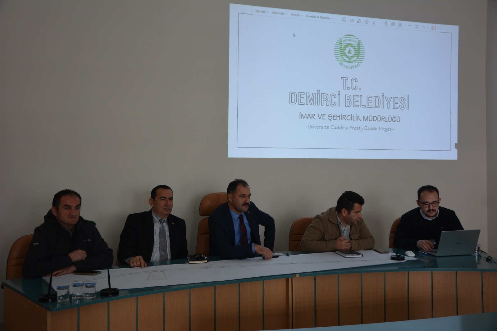 Toplantıda Demirci Belediyesi İmar ve Şehircilik Müdürlüğünce hazırlanan prestij caddesi projesi projeksiyonla ekrana yansıtıldı.