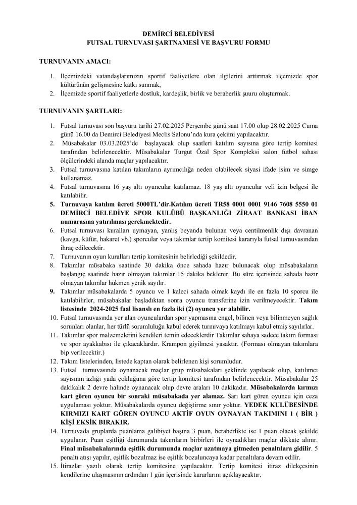 Futsal turnuvasına katılmak isteyenlerin aşağıda bulunan şartname ve başvuru formunu doldurarak Demirci Belediyesi Santral Birimine ulaştırmaları gerekmektedir.