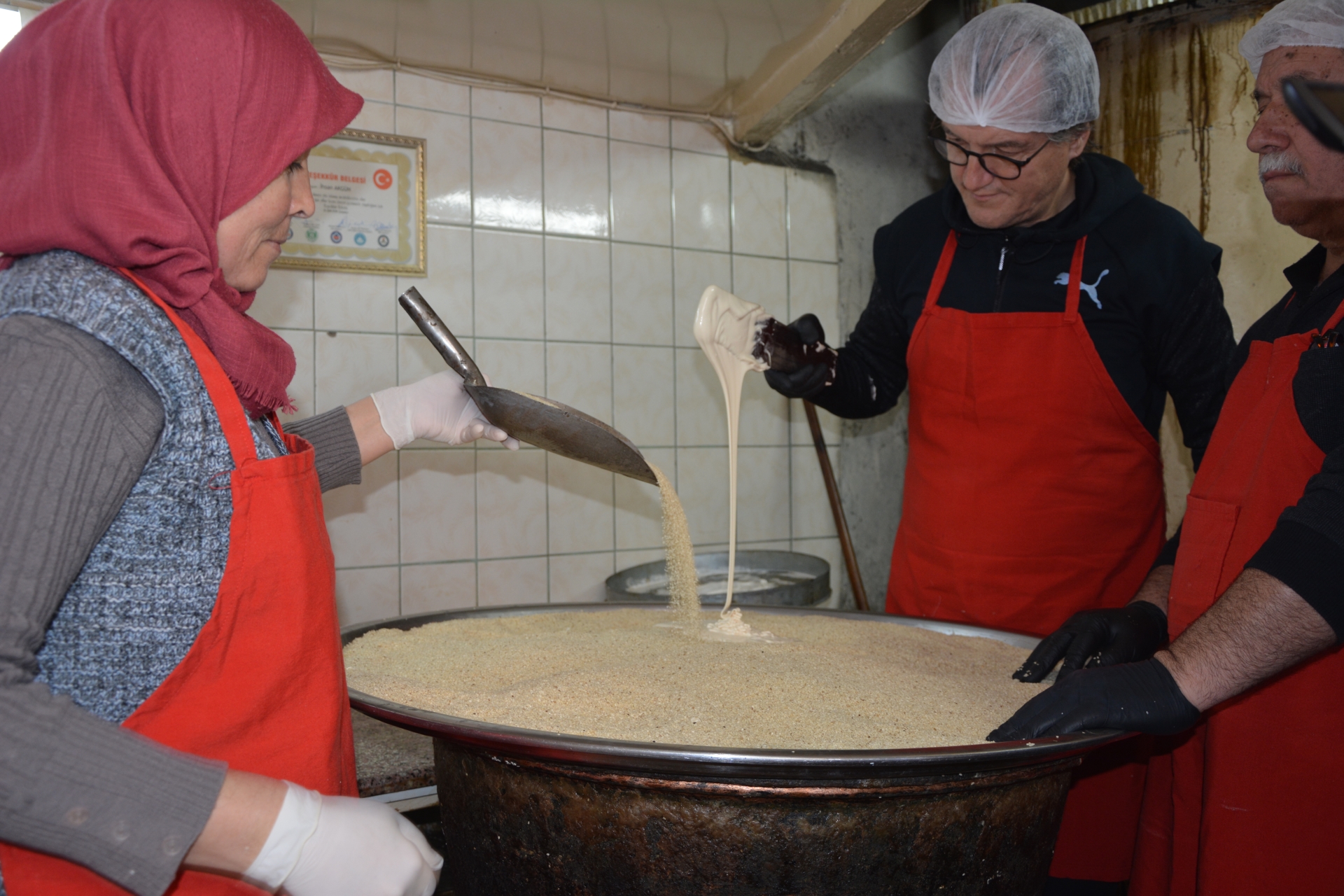 Babasından devraldığı mesleğini sürdüren Helvacı İhsan Akgün helva üretimini yapmak için oğlu Mustafa Akgün ve ailesi ile birlikte sabah erkenden işyerine gelerek baba yadigârı kazanda susamlı helvanın şerbeti hazırlanıyor.
