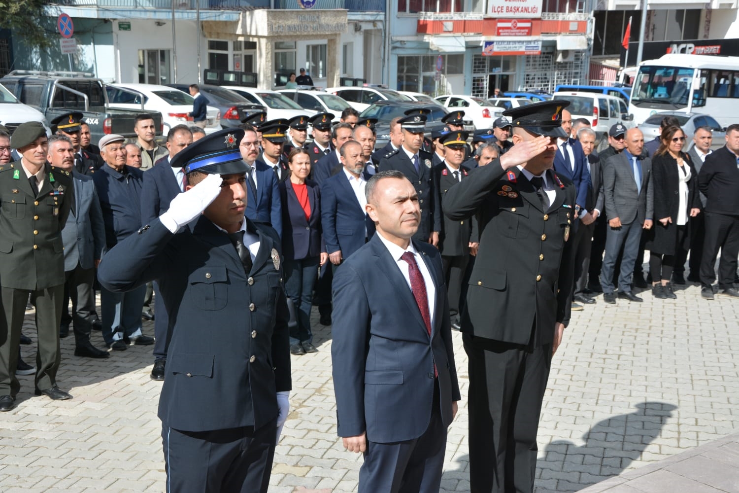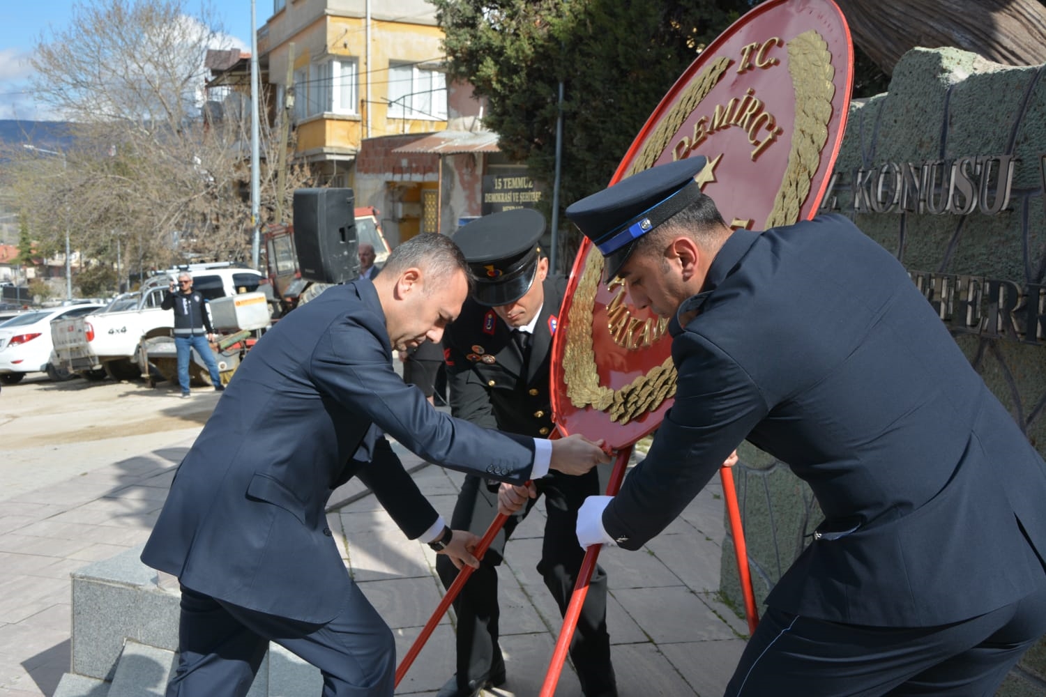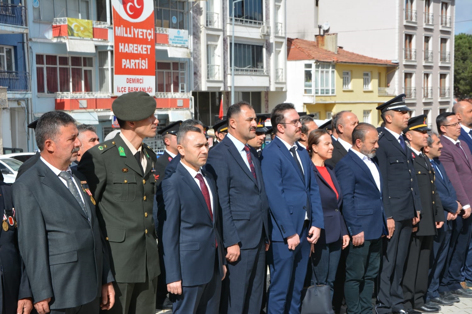 Demirci Kaymakamımız Yavuz Arslan, Belediye Başkanımız Erkan Kara, Garnizon Komutanı Mly. Binbaşı Hüseyin Cihan Korkmaz tarafından Atatürk anıtına çelenk sunumu yapıldı.