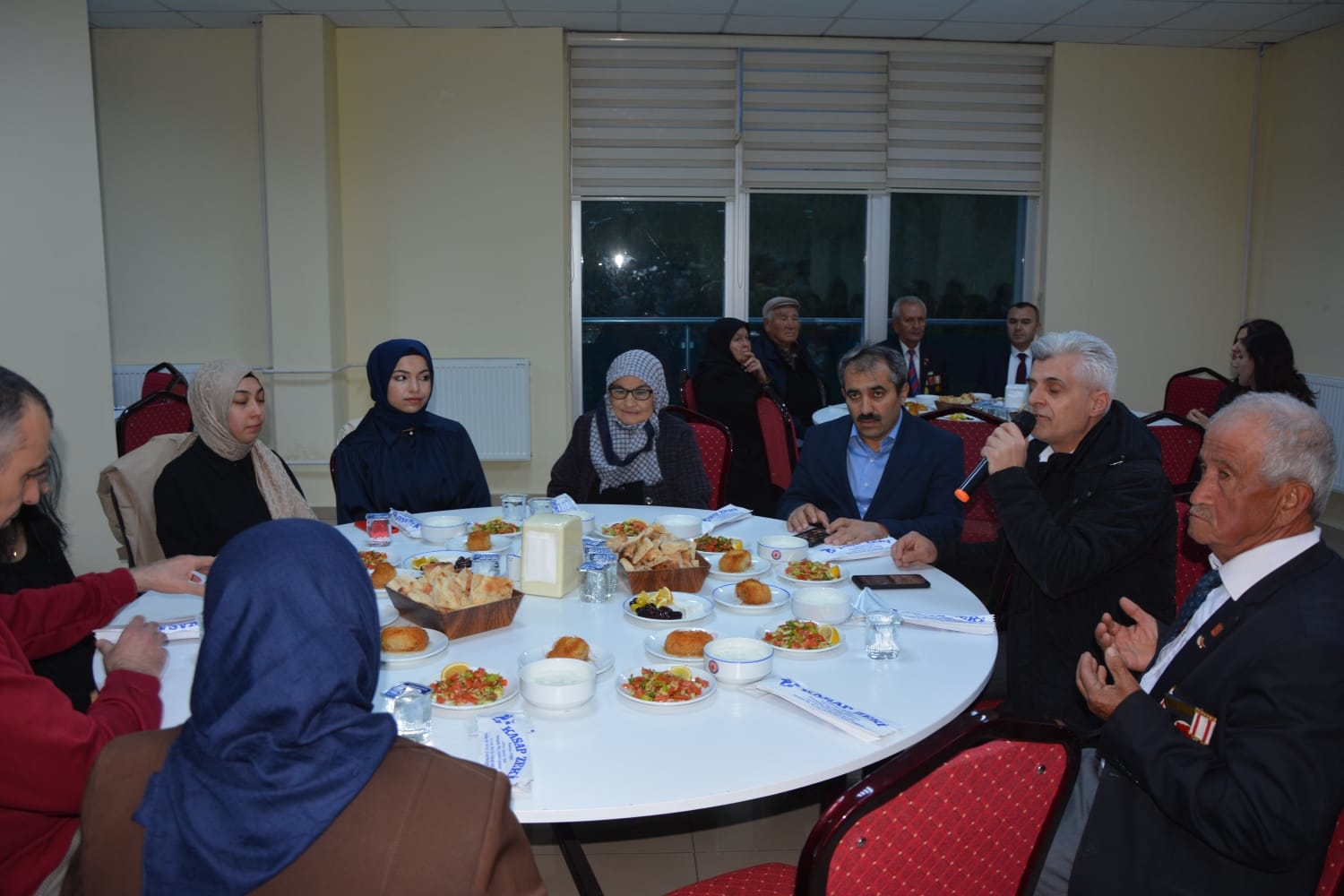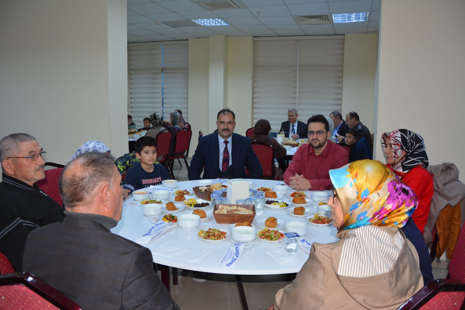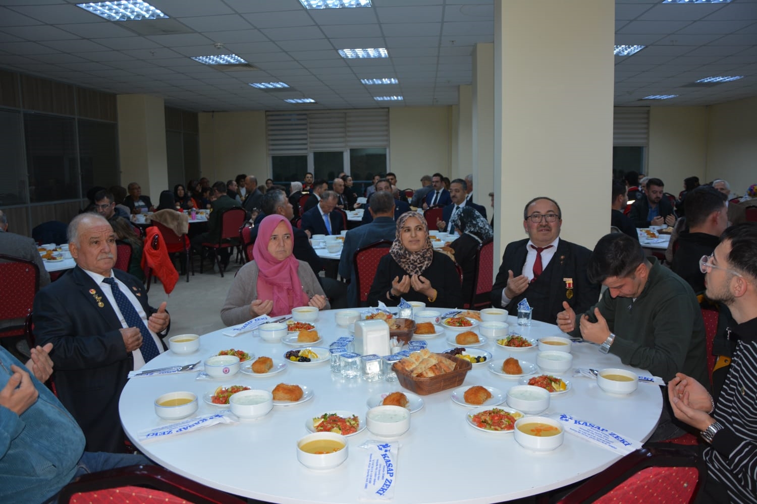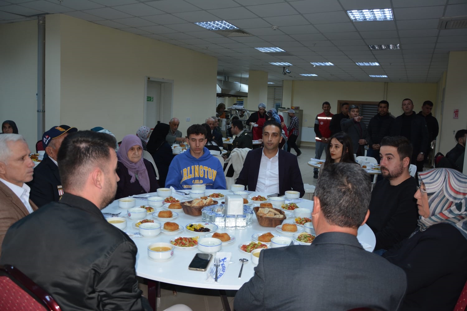 Kaymakamımız Yavuz Arslan ve Başkanımız Erkan Kara, iftar yemeği programına katılan Şehit Aileleri, Gaziler ve Gazi ailelerini masalarında ziyaret ettiler.