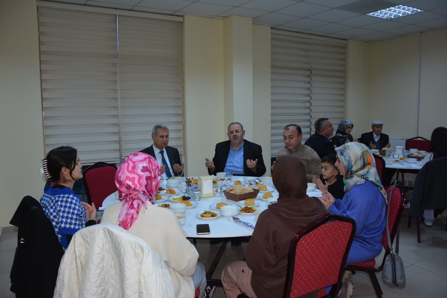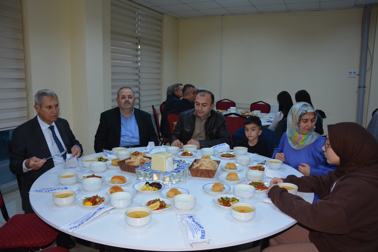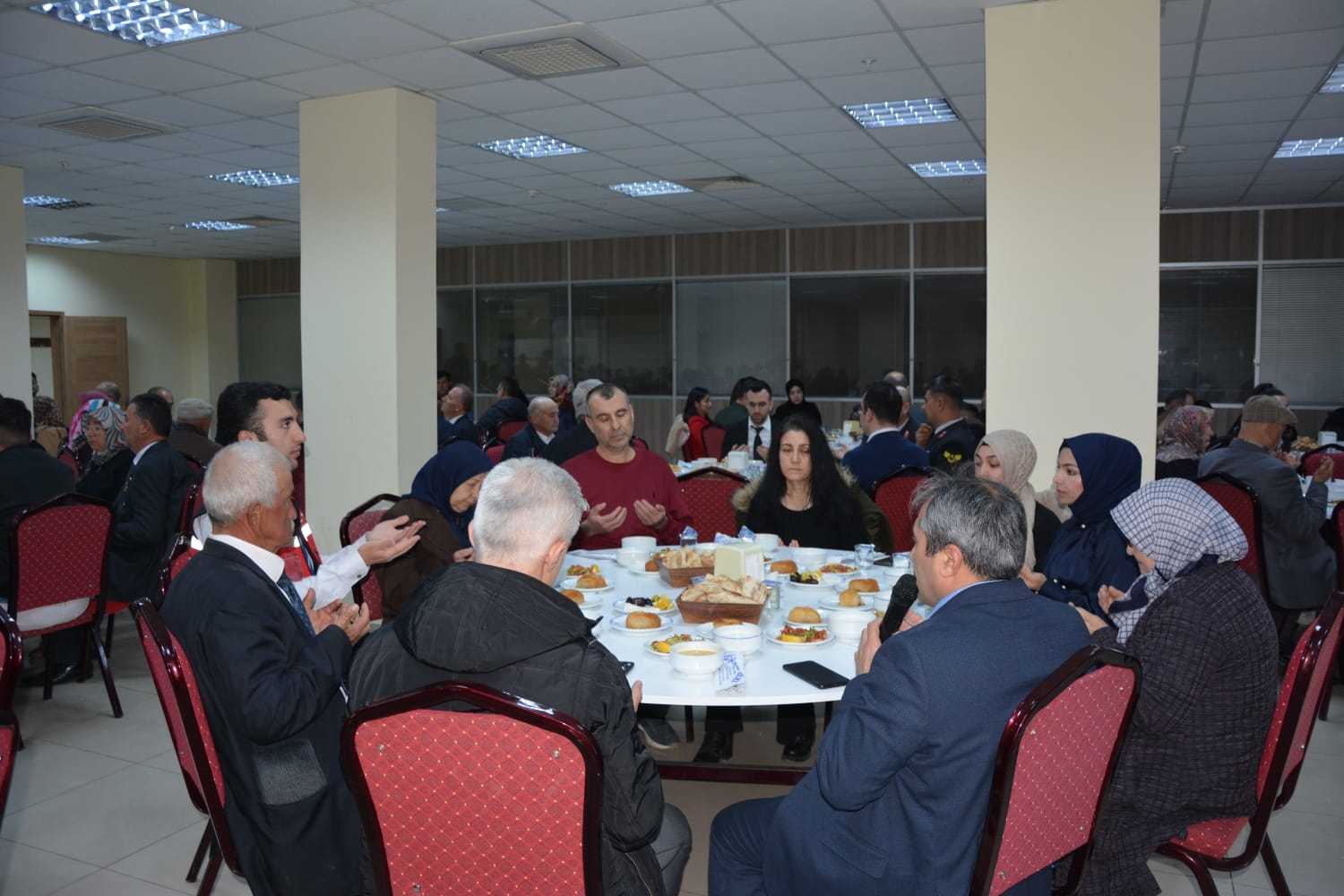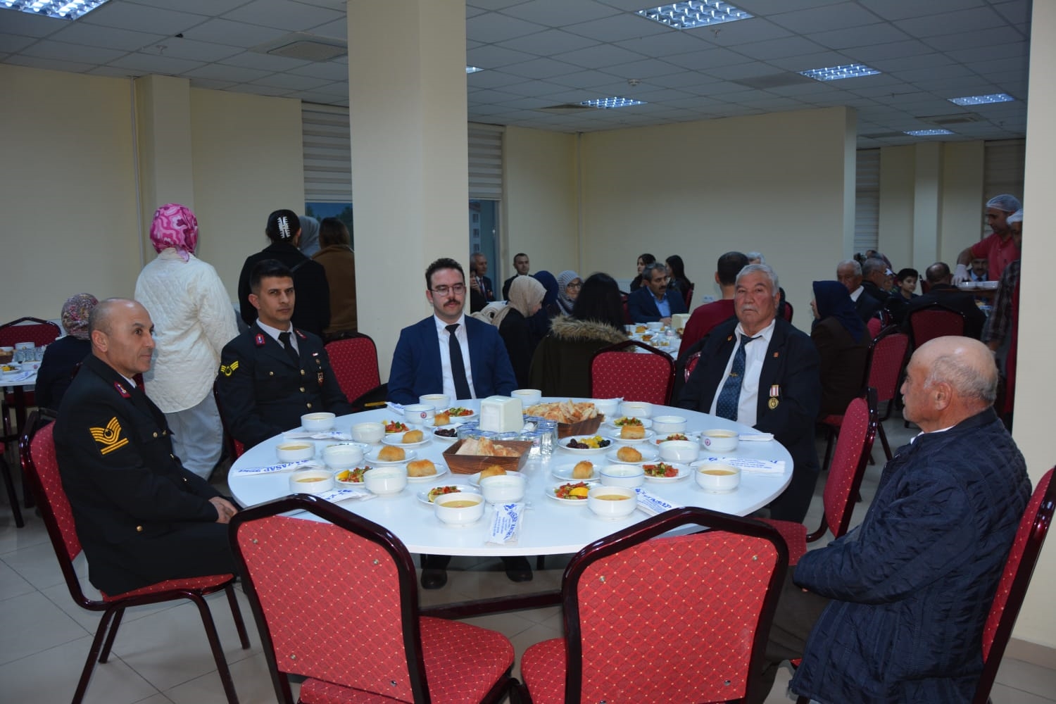 Kaymakamımız Yavuz Arslan ve Başkanımız Erkan Kara, iftar yemeği programına katılan Şehit Aileleri, Gaziler ve Gazi ailelerini masalarında ziyaret ettiler.