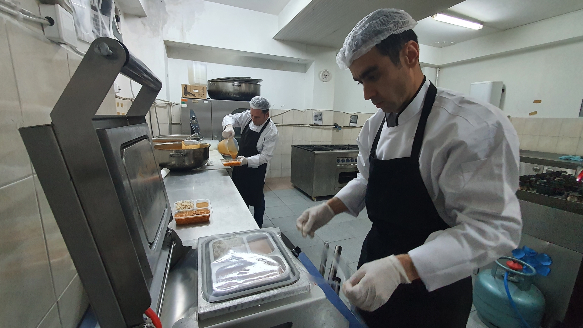 Demirci Belediyesi aşevinde aşçılar tarafından özenle hazırlanan 3 çeşit sıcak yemek itina ile paketlenerek hazırlanıyor.