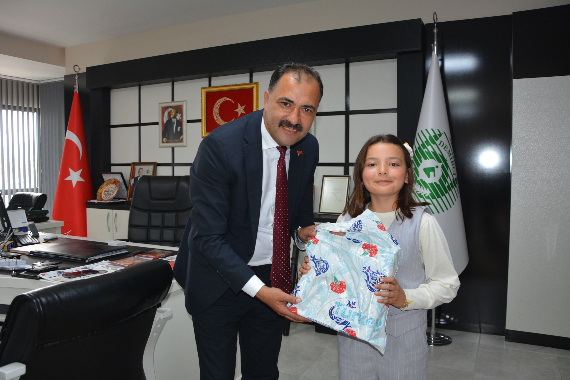 Belediye Başkanımız Erkan Kara’da, 23 Nisan Ulusal Egemenlik ve Çocuk Bayramı dolayısıyla Fatih Ortaokulu 5 sınıf öğrencisi Ayşe Akkaya ve Ziya Gökalp Nurettin Kelem Ortaokulu 5. Sınıf öğrencisi Gülhizar Durak’a günün anısına çeşitli hediyeler takdim ederken, eğitim hayatlarında sonsuz başarılar diledi.