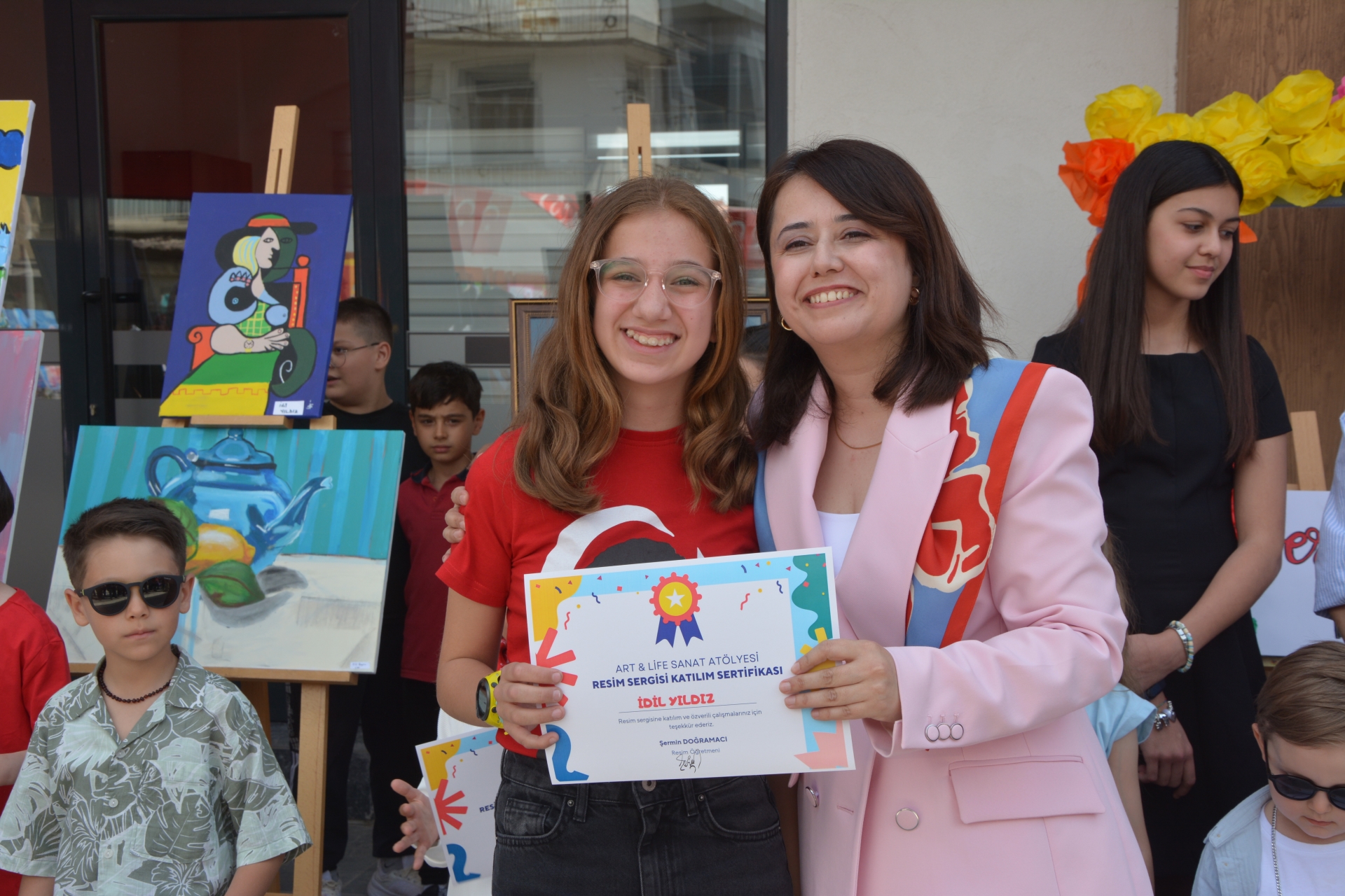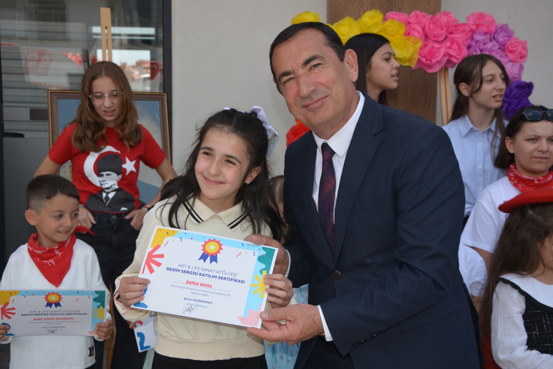Başkanımız Erkan Kara, İlçe Milli Eğitim Müdürü Bilal Çetinkaya ve Başkan Yardımcımız İsmail Hakkı Gül, resimleri hazırlayan öğrencilere başarı belgelerini takdim ettiler.