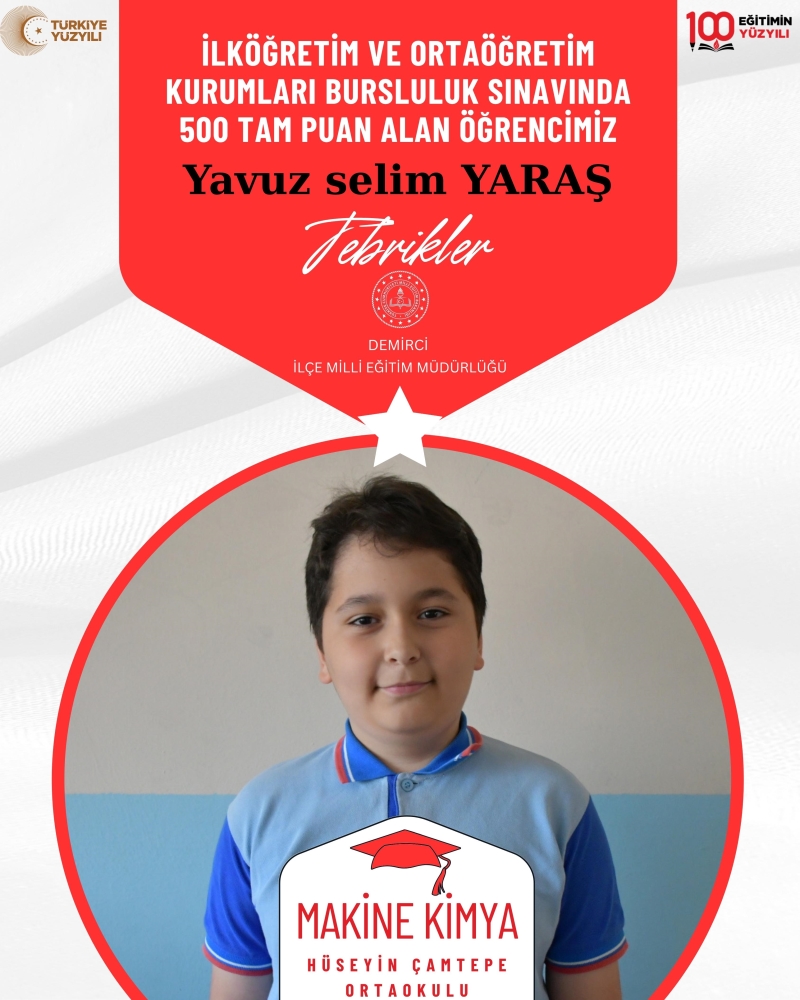 Makine Kimya – Hüseyin Çamtepe Ortaokulu 5. Sınıf öğrencisi Yavuz Selim Yaraş 27 Nisan 2025 Pazar günü yapılan İlköğretim ve Ortaöğretim Kurumları Bursluluk sınavında 80 sorunun tamamını doğru yapmayı başardı.