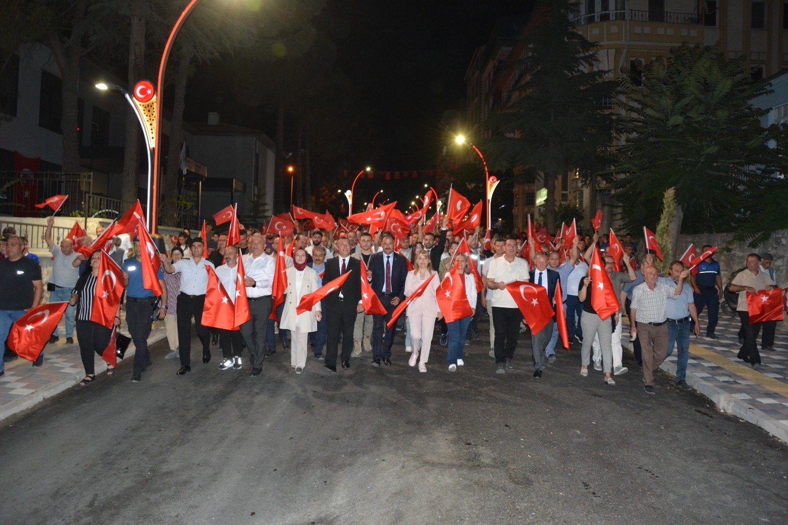 Yürüyüşte İlçe halkı ve gençler 200 metre uzunluğunda dev Türk bayrağı açarak yürüdüler.