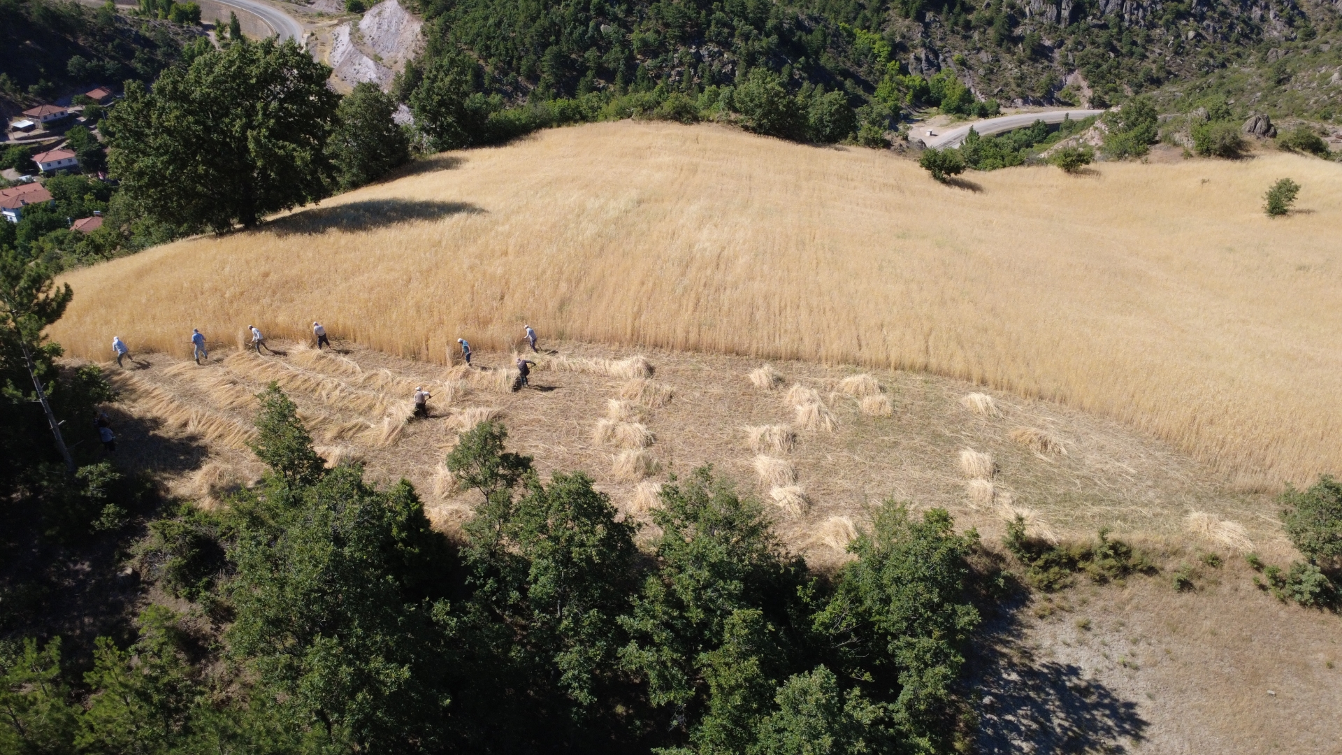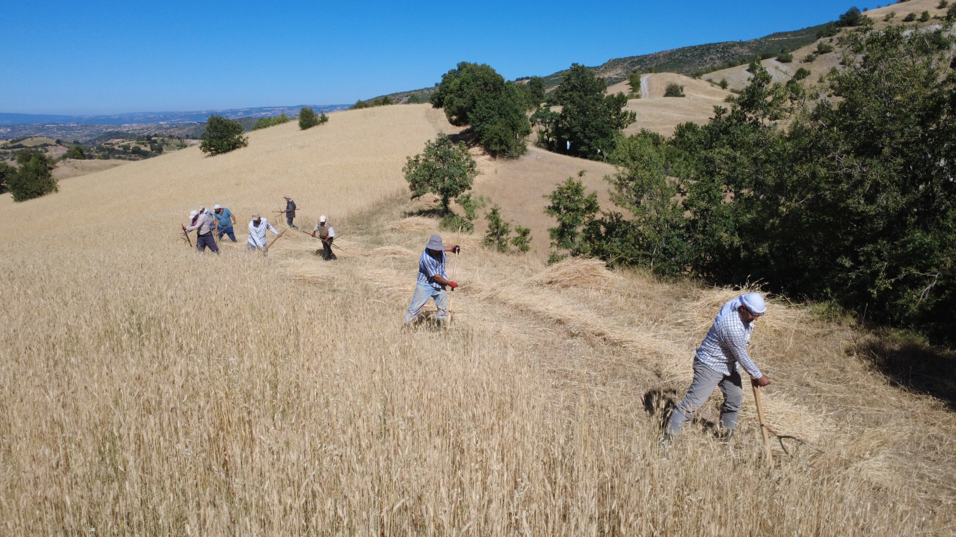 Erkekler tarafından toplanan ekinler kadınlar tarafından da çevrede kalan arpa ve buğday saplarını da tırmıklarla toplayarak yardım ediyor.