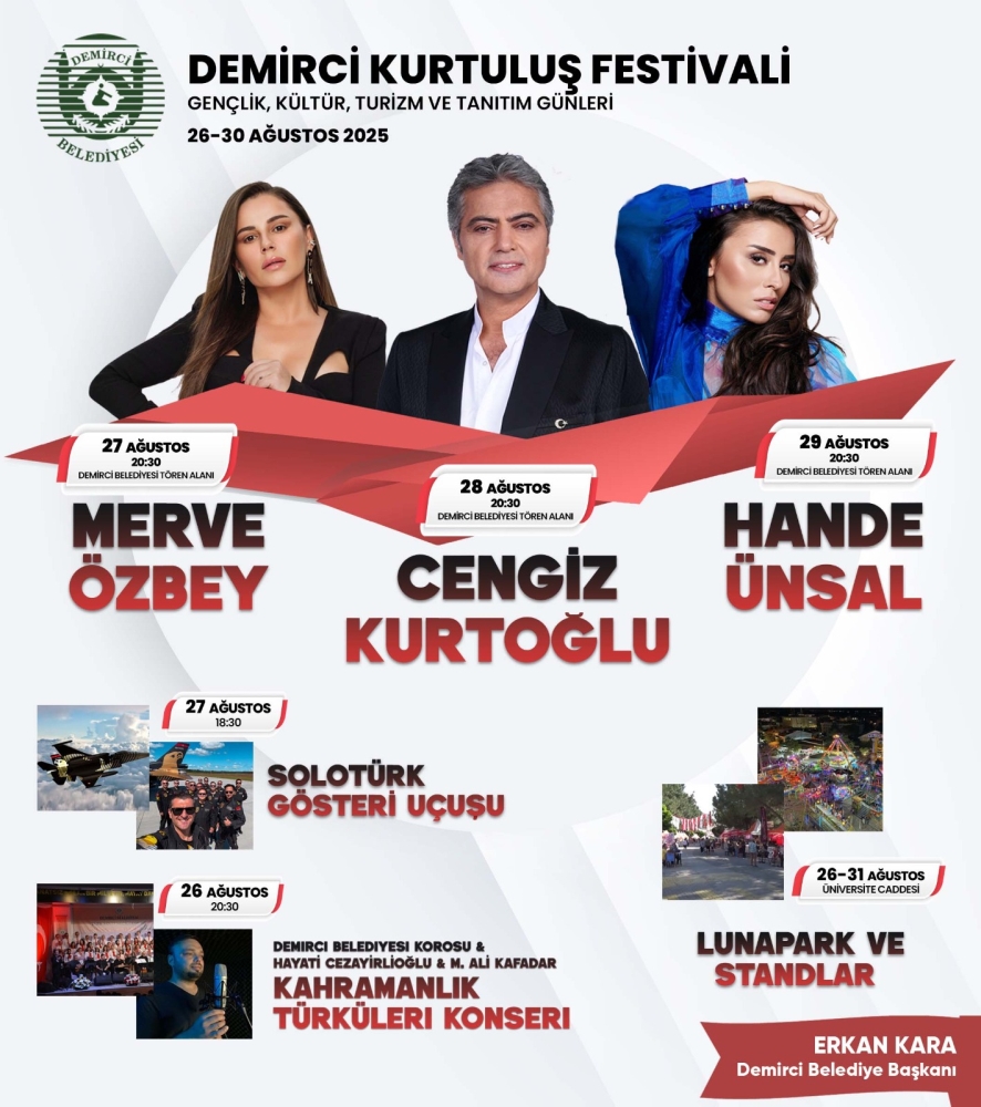 Demirci Kurtuluş Festivalinde Demirci Belediyesi Türk Sanat Müziği Korosu, Cengiz Kurtoğlu, Merve Özbey, Hande Ünsal ve Ece Mumay sahne alacak.
