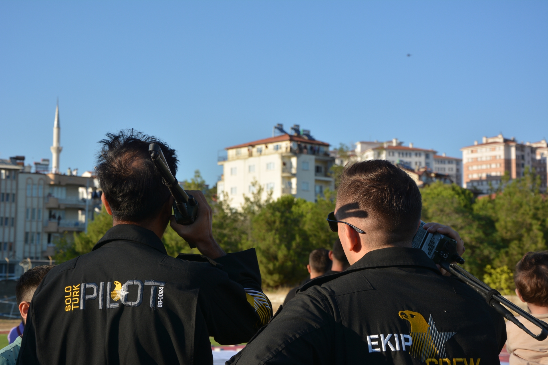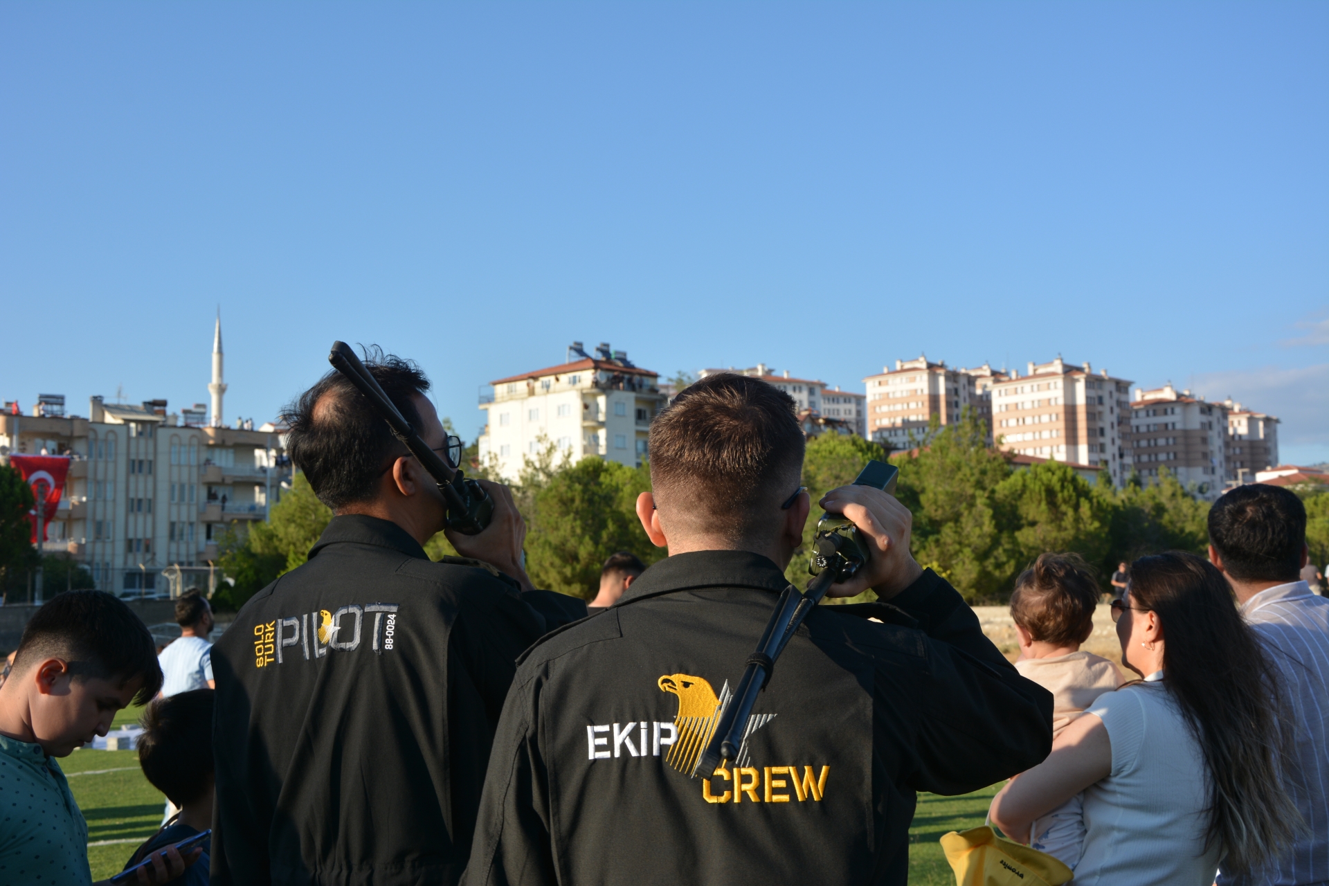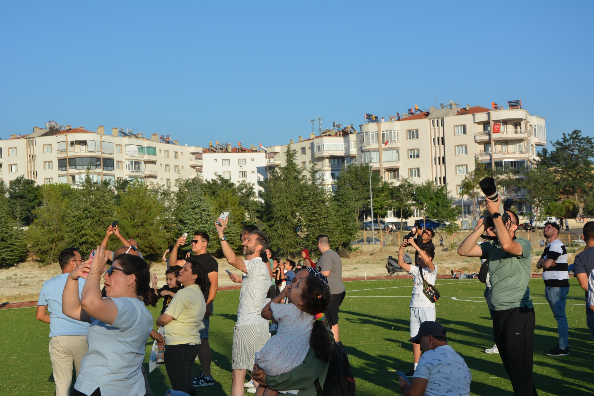 Vatandaşlar prova uçuşunu izlemek için Eğitim Fakültesi suni çim sahaya akın ederken, kimi vatandaşlarda evlerinin balkonlarına, çatılarına ve yüksek tepelere çıktılar.