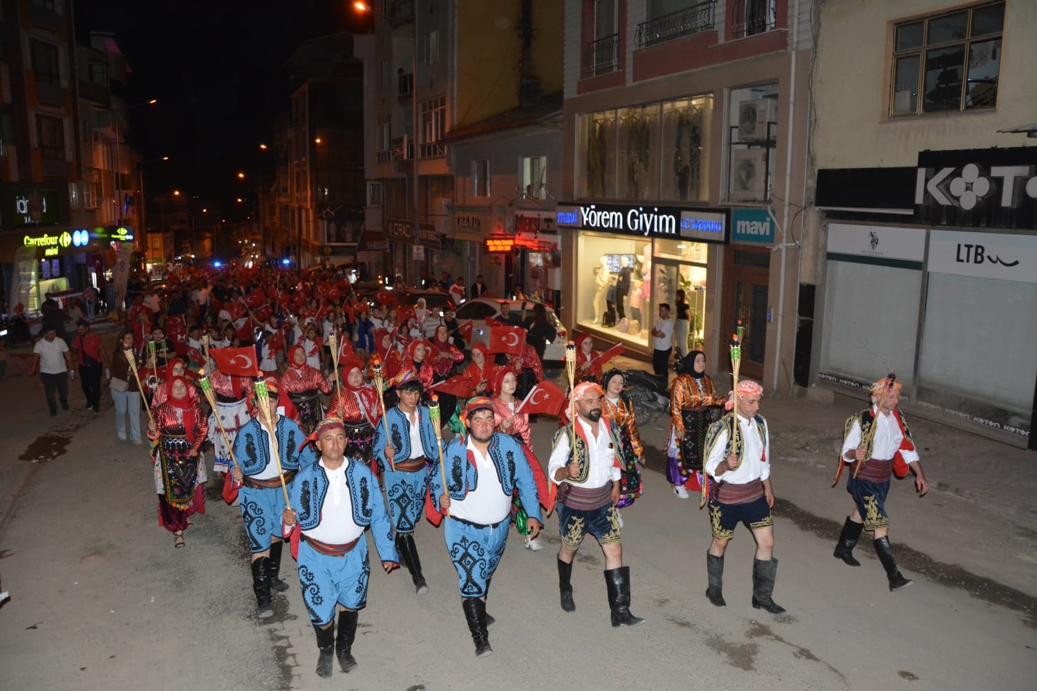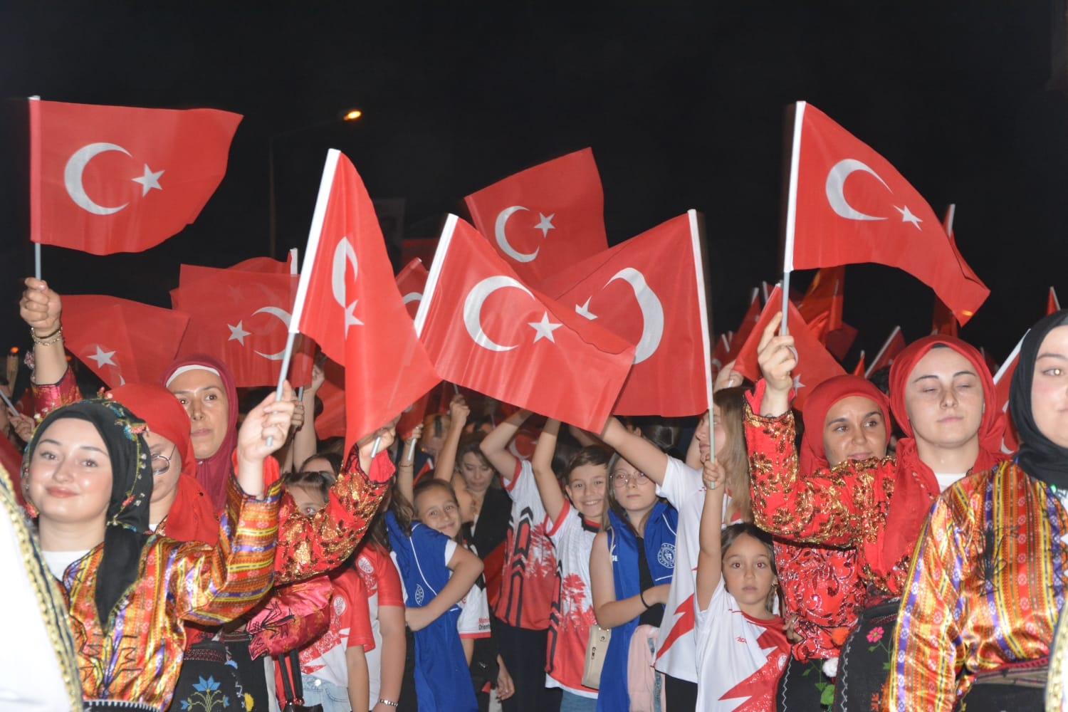 Vatandaşlar marşlar ve şarkılar eşliğinde bayraklarla 30 Ağustos Zafer Bayramı için yapılacak olan konser alanına kadar coşku içinde yürüyüş yaptı.