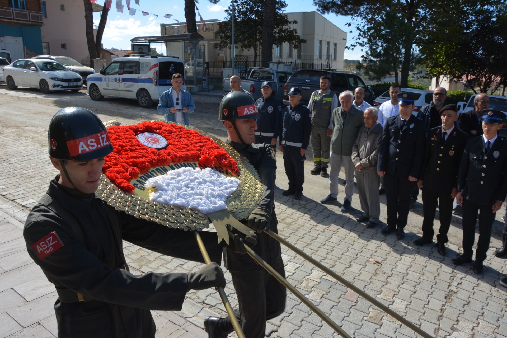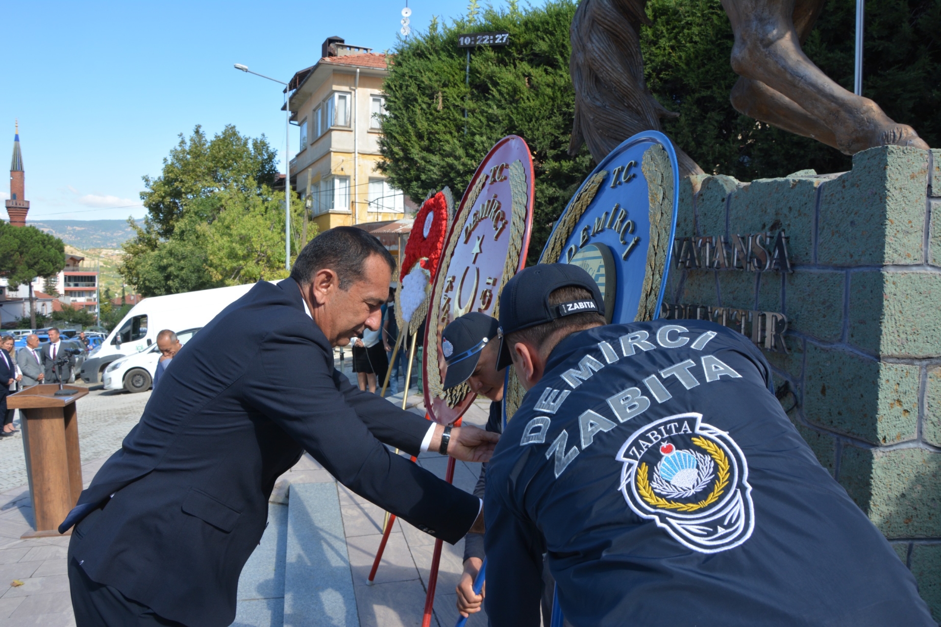Törende ilk olarak Kaymakamımız Fatih Bayram, Belediye Başkan Yardımcımız İsmail Hakkı Gül, Garnizon Komutanı Mly. Binbaşı Hüseyin Cihan Korkmaz ve Demirci Muharip Gaziler Derneği Başkanı Kamil Aydemir tarafından Atatürk anıtına çelenk sunumu yapıldı.