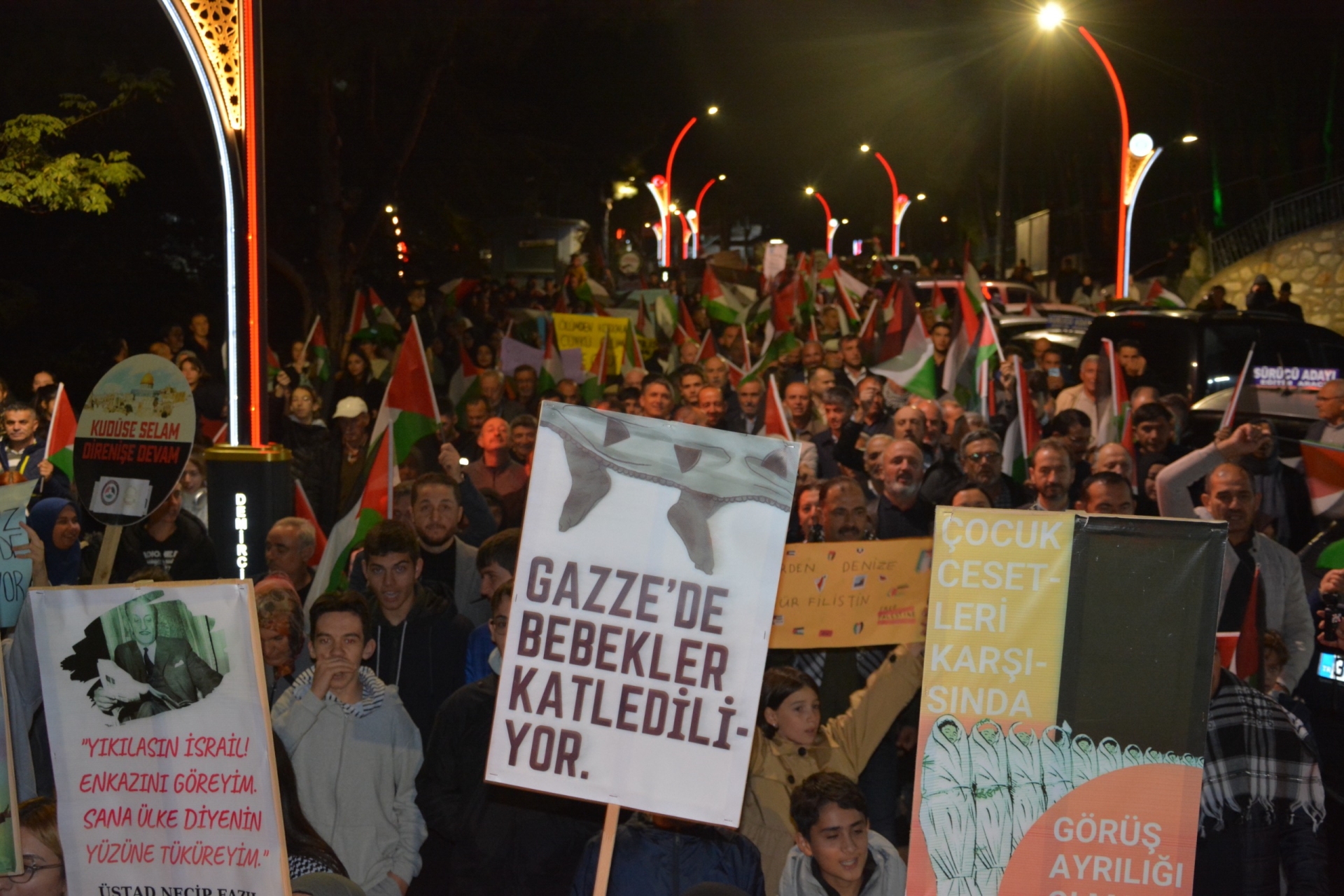 Çereşe meydanına kadar devam eden yürüyüşün ardından konuşma yapan Belediye Başkanımız Erkan Kara “ Siyonist İsrail’in Filistin üzerine kurmuş olduğu barbarca haince bir soykırımı protesto etmek için bir kez daha haykırıyoruz. Kahrolsun İsrail, Yaşasın Filistin. Tüm zalimlerin karşısında duran, Dünya beşten büyüktür diyen bir Dünya Liderimiz. İyiki Türkiye var. İyiki Recep Tayyip Erdoğan Var ”dedi.