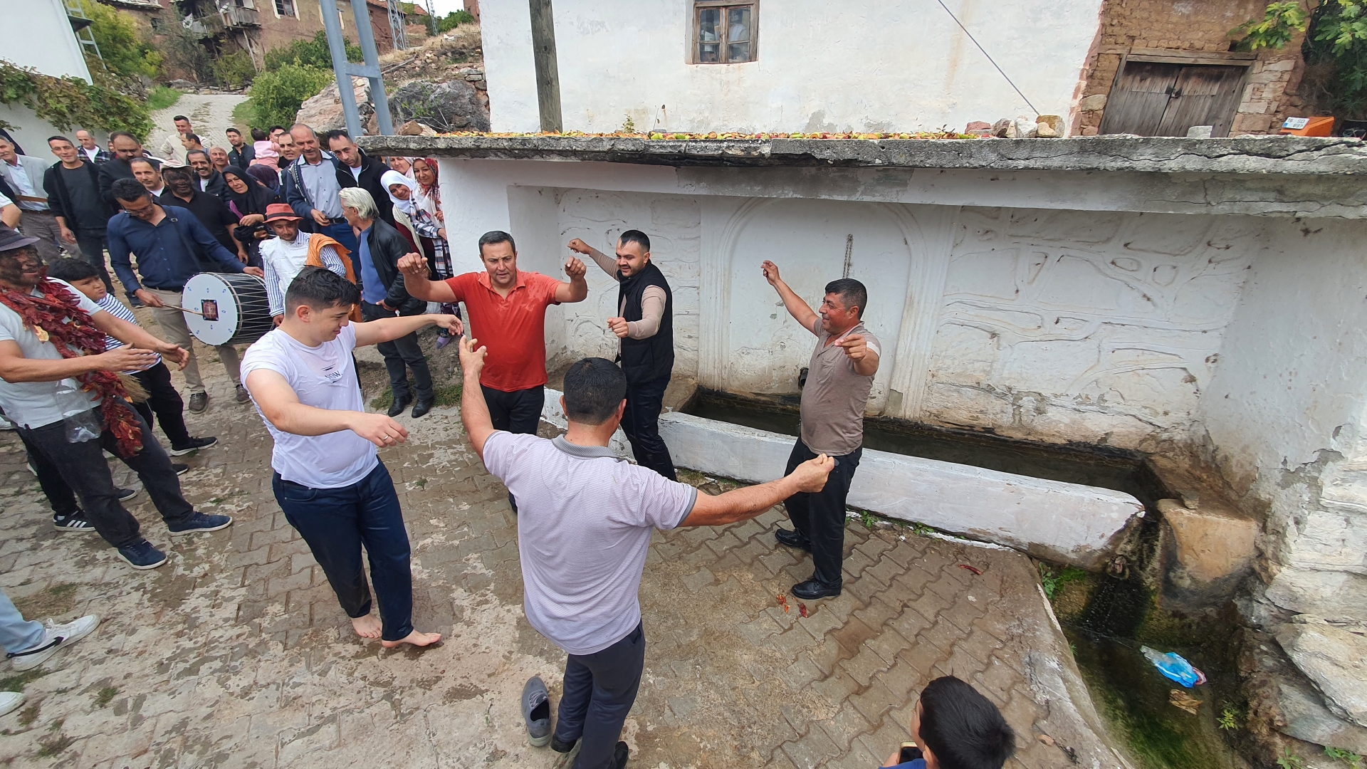 Su dolu yalağa atılan akrabalar ise çıktıktan sonra davul zurna eşliğinde meydanda oynuyor.