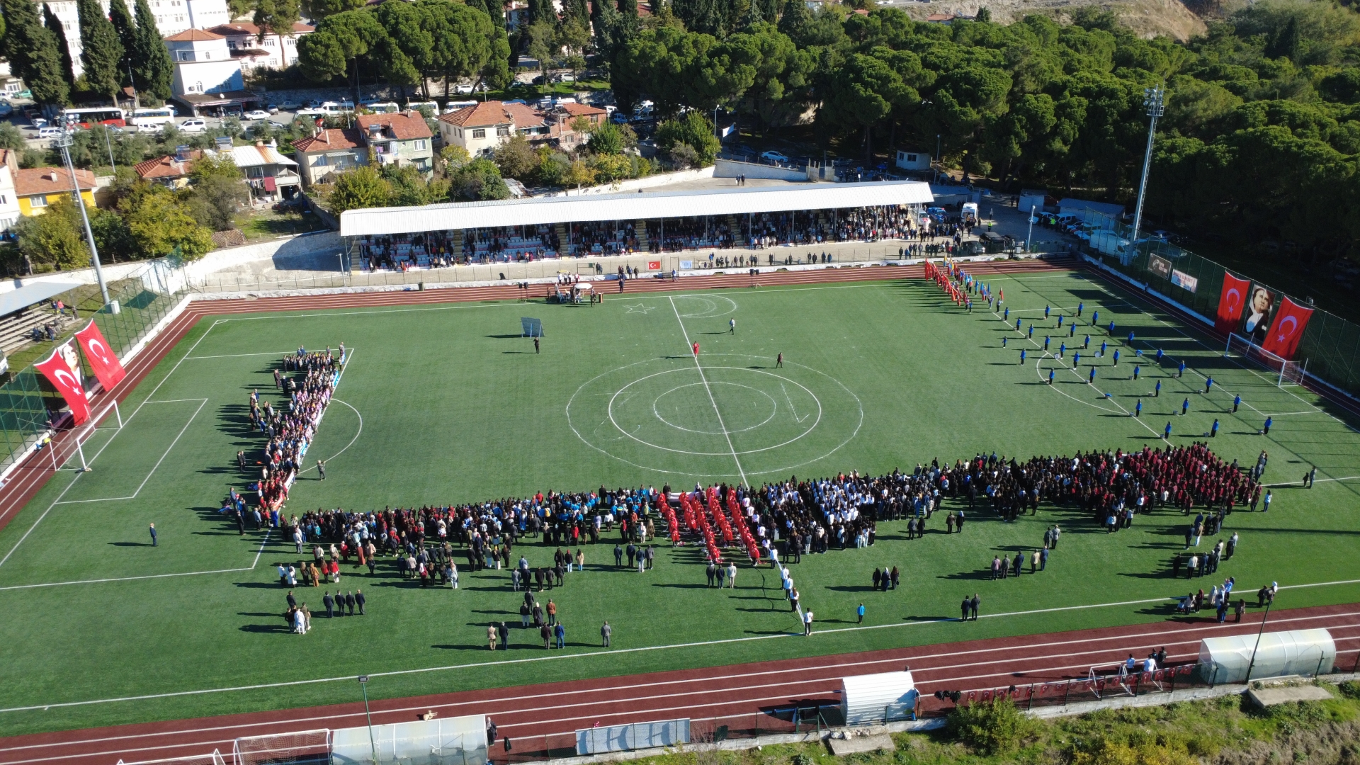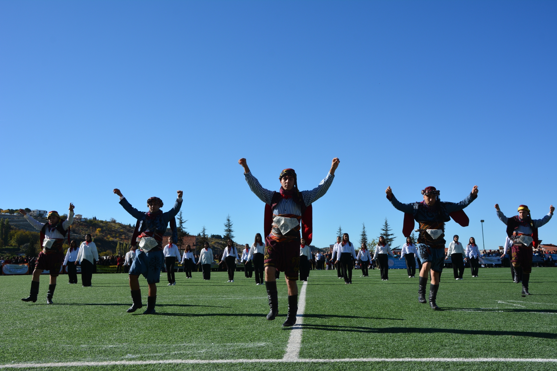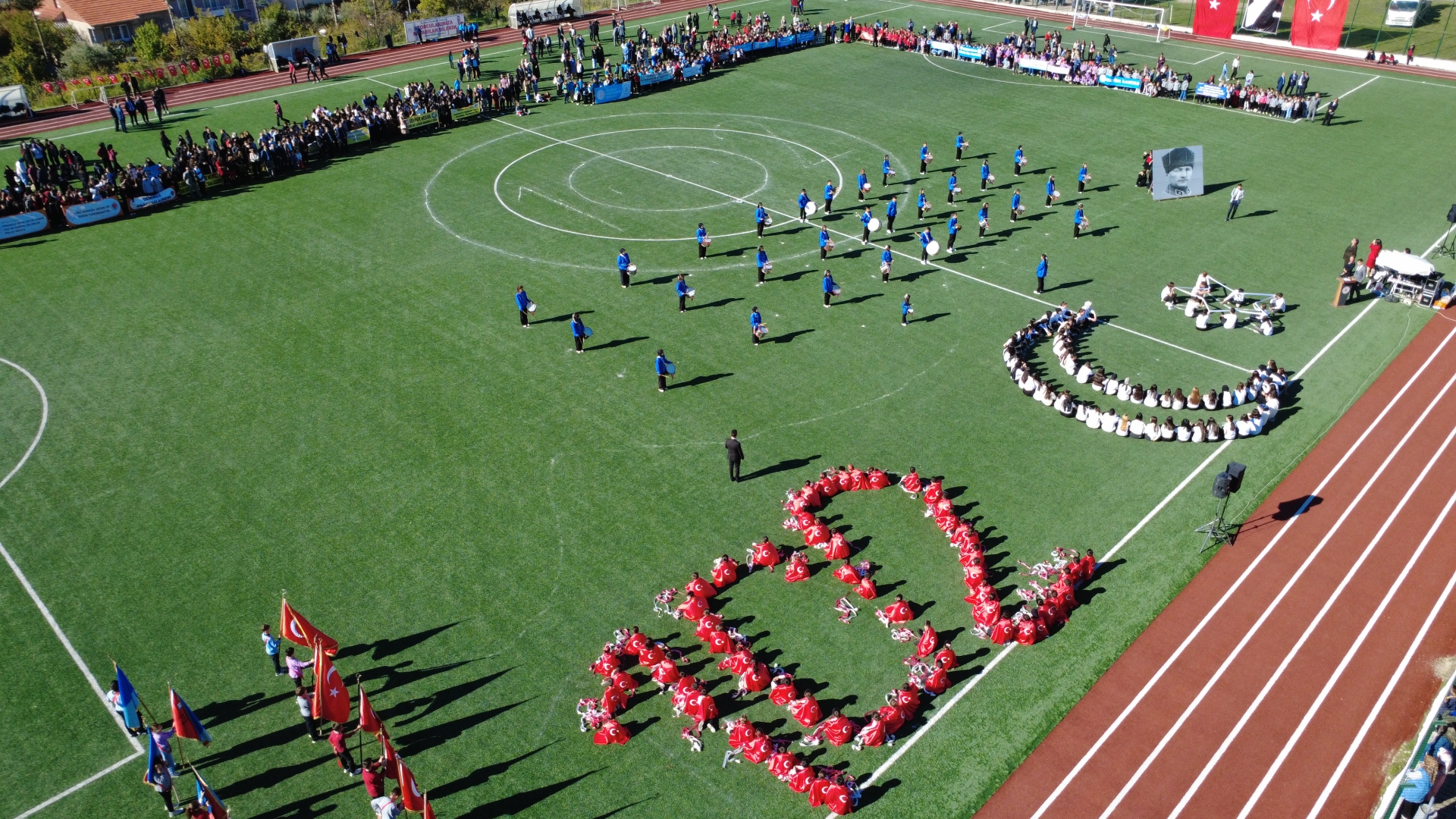 Gevher Nesibe Mesleki ve Teknik Anadolu Lisesi ve 75. Yıl Alime Paşa Ortaokulu öğrencileri bedenleri ile gösteriler kapsamında stada 102 ve Ayyıldız koreografisini çizdiler.