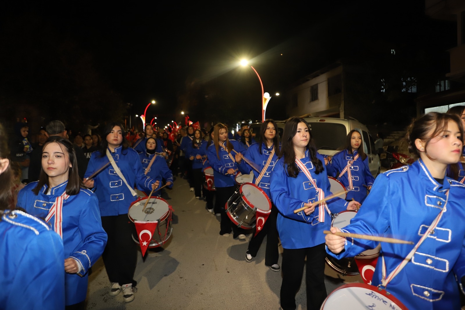 Fener alayında meşaleler eşliğinde öğrenciler bayraklarla fener alayı yürüyüşünü coşku içinde gerçekleştirdi.