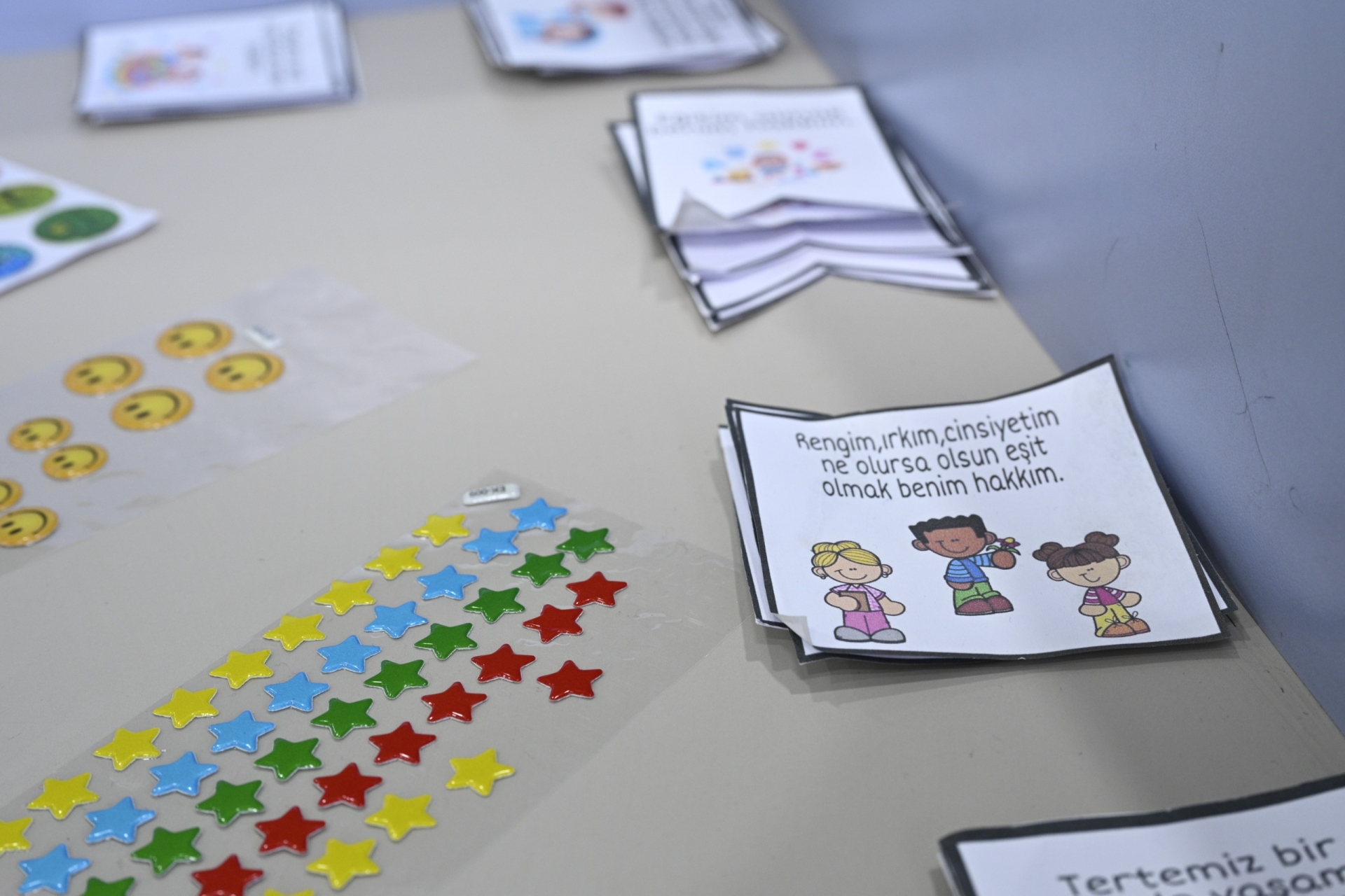 Posterler, el çalışmaları ve kısa mesaj kartlarıyla hak ve özgürlüklerin anlamını kendi ifadeleriyle anlatan çocuklar, günün ruhuna uygun renkli bir atmosfer oluşturdu.