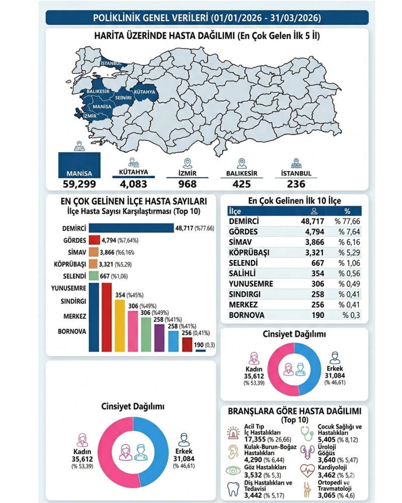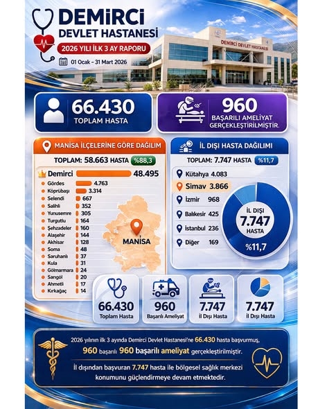 Demirci Devlet Hastanesi tarafından açıklanan 2026 Yılı İlk 3 Ay Raporu, sağlıkta gelinen noktayı rakamlarla özetledi: