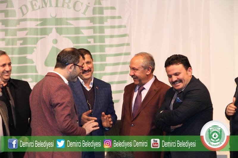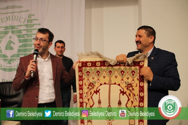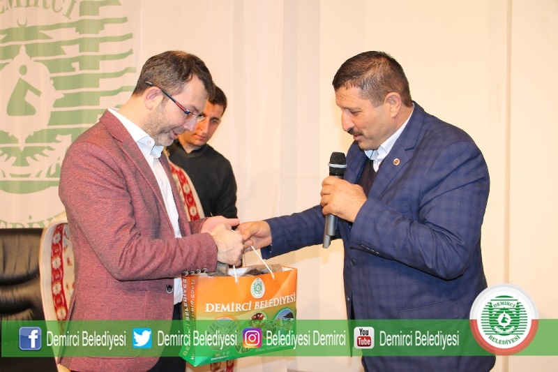 Programdan sonra Demirci Kaymakamı Mutlu Akyol ve Belediye Başkanı Selami Selçuk tarafından Gazeteci Turgay Güler ve Prof. Dr. Mehmet Çelik'e yöresel Demirci ürünlerinin yer aldığı çanta ve Demirci halısı hediye etti.