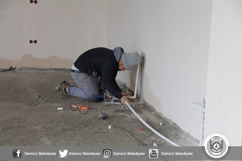 Kent Merkezi inşaatında kaba inşaatın tamamlanması ile birlikte iç cephe düzenlemelerine hız verilirken, elektrik tesisatı, su tesisatı döşemesine de devam ediliyor.
